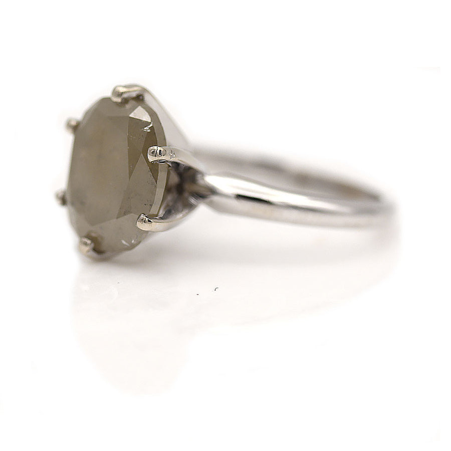 The Claudonna ring is an authentic vintage salt and pepper diamond engagement ring circa 1980s. This original engagement ring features a unique prong set 4.40 carat salt and pepper oval cut diamond with gray overtones. Crafted in a classic 14 kt white gold setting, this is a stunning ring that is in very good condition.