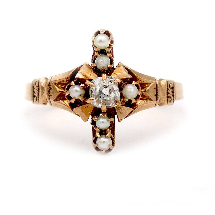 The Reese ring is an authentic vintage engagement ring from the Victorian era circa 1900's. The ring features a .20 carat old mine cut diamond of H color, VS2 clarity, surrounded by 6 vintage seed pearls. Crafted in gleaming 18 karat rose gold, accentuated with delicate filigree engravings. A charming antique jewel, in excellent condition.