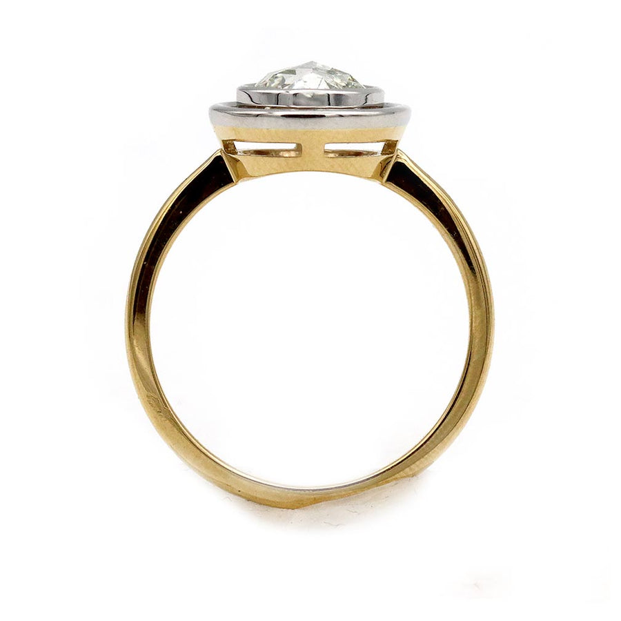 The Ena ring is a VintageDiamondRing.com Victorian style engagement ring featuring an authentic 1920s .75 carat natural bezel set rose cut diamond of J color and SI2 clarity. This diamond resides in a delicate two tiered halo, beautifully crafted in platinum and 18 kt gold. Very hard to find, and as sweet as can be.