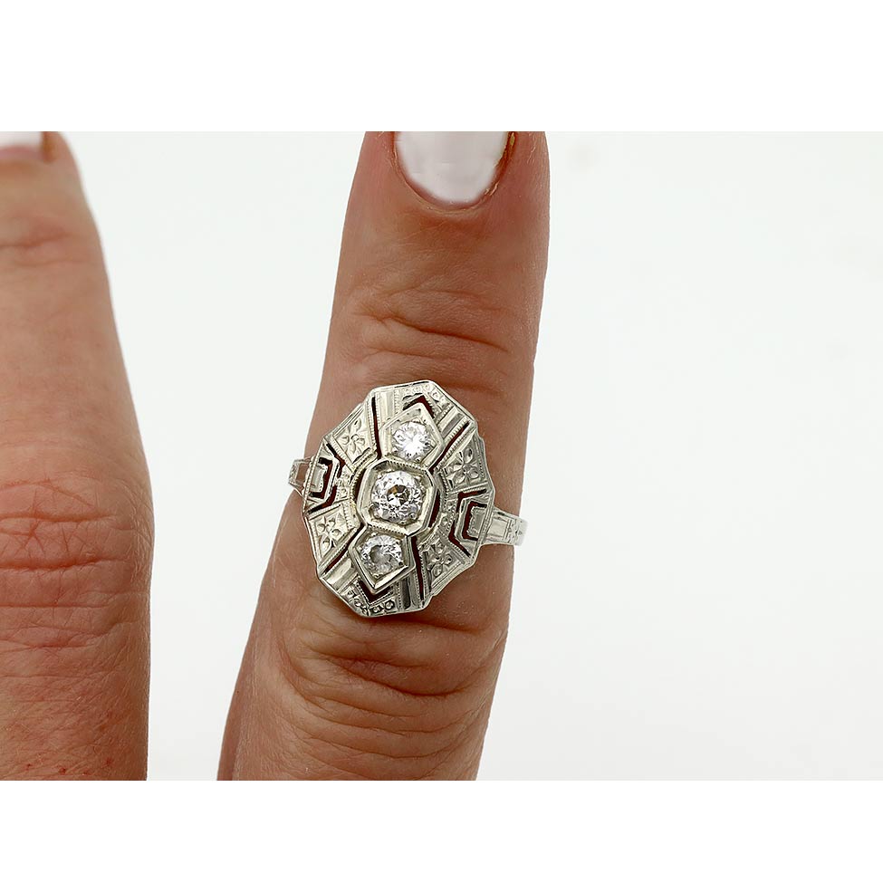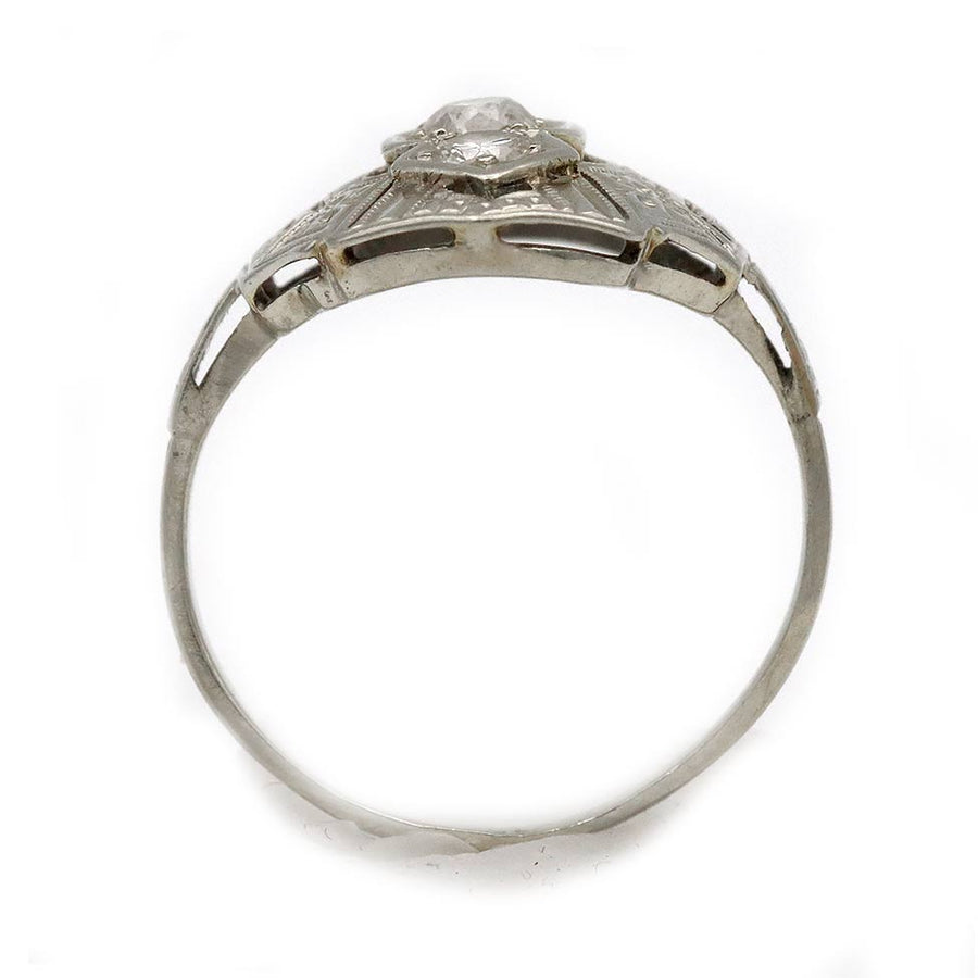 The Patricia ring is an authentic vintage engagement ring from the Edwardian era circa 1920s. The ring features a .25 carat old European cut diamond, residing in a geometric octagonal setting flanked by 2 old European cut diamond accents. Crafted in 14 karat white gold, accentuated with open metal work and filigree engravings. A magnificent cocktail ring! Perfect to wear on either hand, in very good condition.