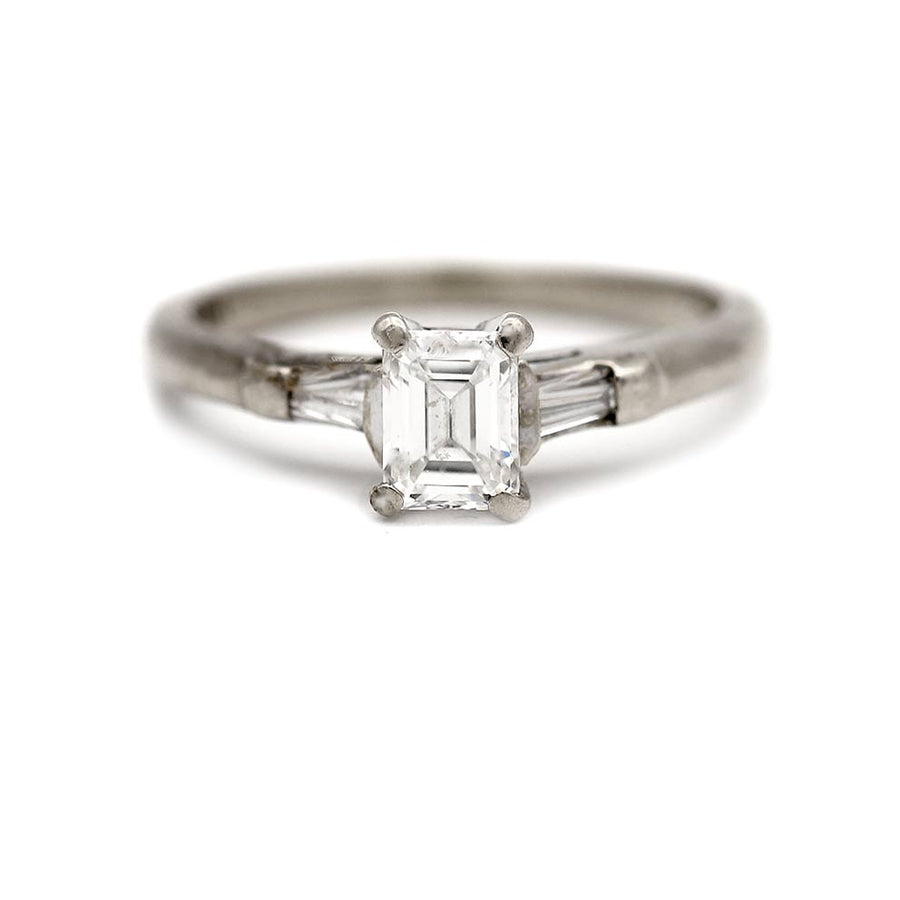 The Camie ring is an authentic vintage engagement ring circa 1970s. This ring features a vintage .55 carat emerald cut diamond with H color and VS2 clarity, flanked by two (2) tapered baguette diamond accents. Beautifully hand-crafted in 14 kt white gold. A consummate vintage three stone ring, in very good condition.