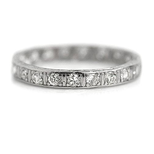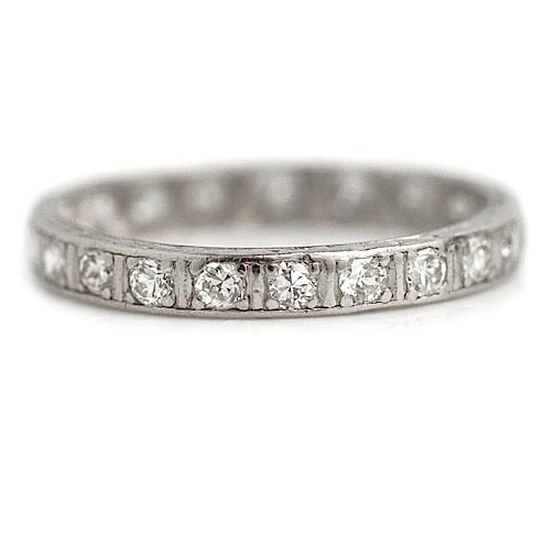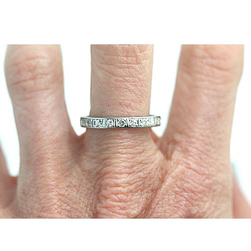 The Georgette band is an estate vintage eternity band featuring 21 glittering original old European cut diamonds weighing 1.25 carat (J color and VS2 clarity). Crafted in the 1970's in 14 kt white gold, finished with side wall filigree engravings. In very good condition. Perfect to wear with your vintage engagement ring.