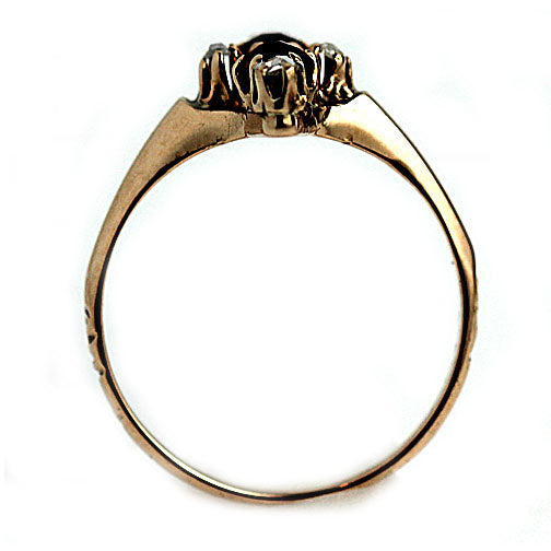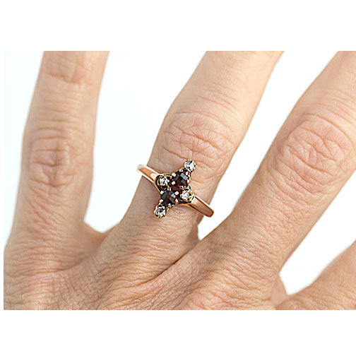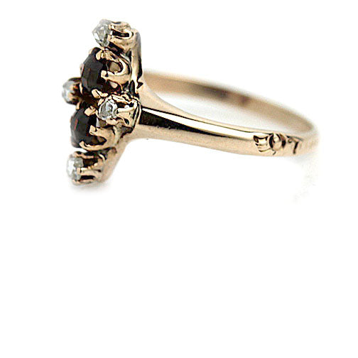 The Loren ring is an authentic vintage engagement ring circa 1940's. The ring boasts 2 natural deep red round cut garnets weighing approximately .50 carat and 4 rose cut diamond accents. Crafted in gleaming 14 karat rose gold. A unique vintage gemstone ring. In very good condition.