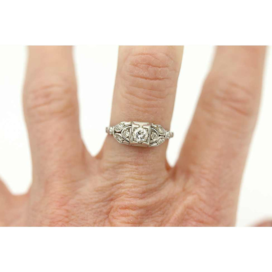 The Galway ring is an authentic vintage engagement ring circa 1930s. This ring features a bright-white old old European cut diamond weighing .25 carat (H color and SI1 clarity), residing within a geometric square frame, and flanked by six (6) single cut diamond accents. Beautifully crafted in 14 kt white gold, and accentuated with delicate milgrain engravings, this is a sweet vintage piece. In good condition.