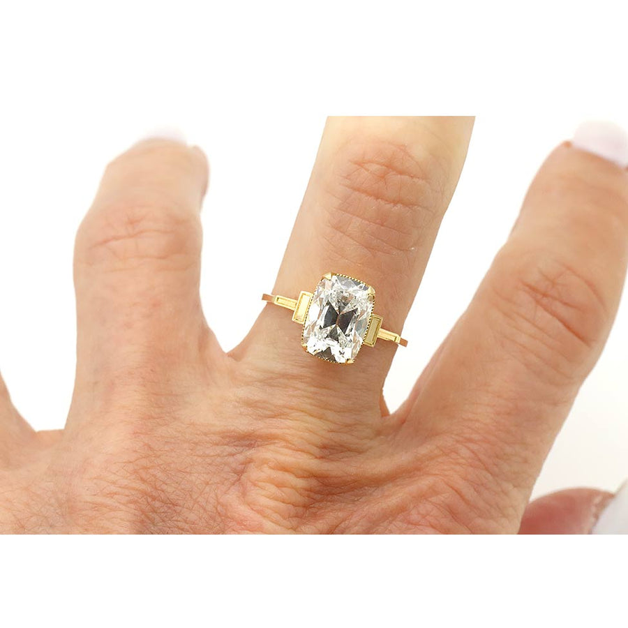 The Wella ring is a vintage-style engagement ring featuring a dazzling and icy-white 2.81 carat old mine lab grown cushion cut diamond, accompanied with an IGI certificate stating E color and VS1 clarity. Beautifully crafted in 18K yellow gold, the band is adorned with detailed filigree engravings. This ring is an exact replica of a vintage piece we once owned. Magnifique! This cushion cut diamond is Lab Grown!