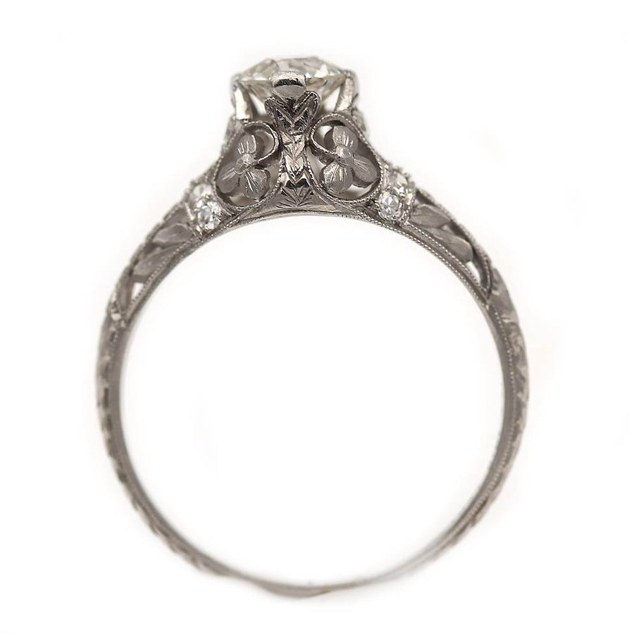 The Merlotti ring is an authentic vintage engagement ring from the Art Deco era, circa 1930's. This ring features a .55 carat old European cut diamond of G color and VS2 clarity, surrounded by ten (10) single cut diamond accents and four (4) three leaf floral motif. Beautifully crafted in platinum, accentuated with delicate milgrain engravings and intricate filigree engravings. A lovely, timeless vintage piece! They don't come any finer. In very good condition.
