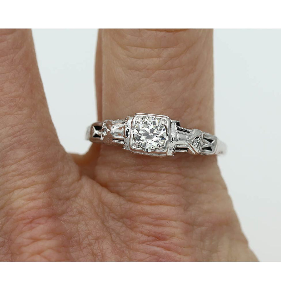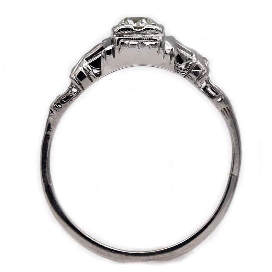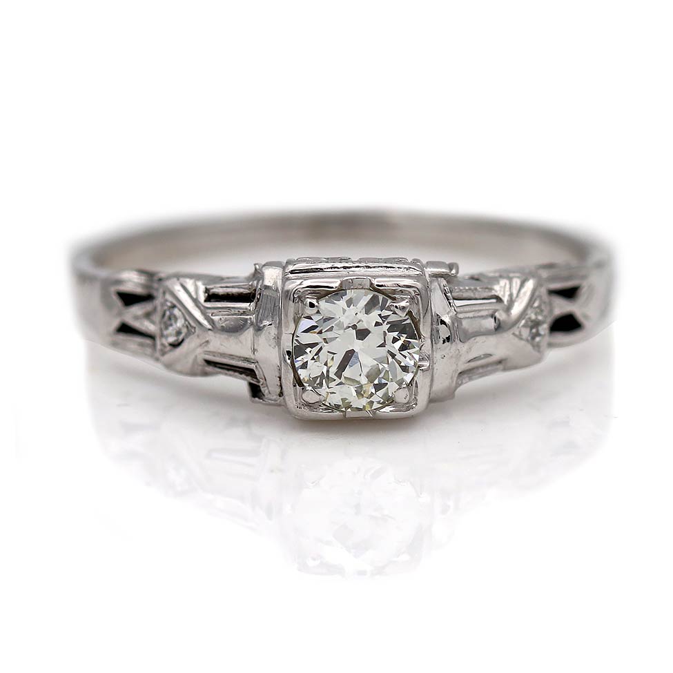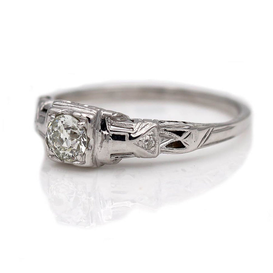 The Heidi ring is an authentic vintage diamond engagement ring from the Art Deco era circa 1930's. The ring features an AGI certified .45 carat old European cut diamond of F color, VS2 clarity, residing in a geometric square frame. Crafted in 14 karat white gold, accentuated with sophisticated linear engravings and a sleek thin band. A scintillating Art Deco ring. In very good condition.