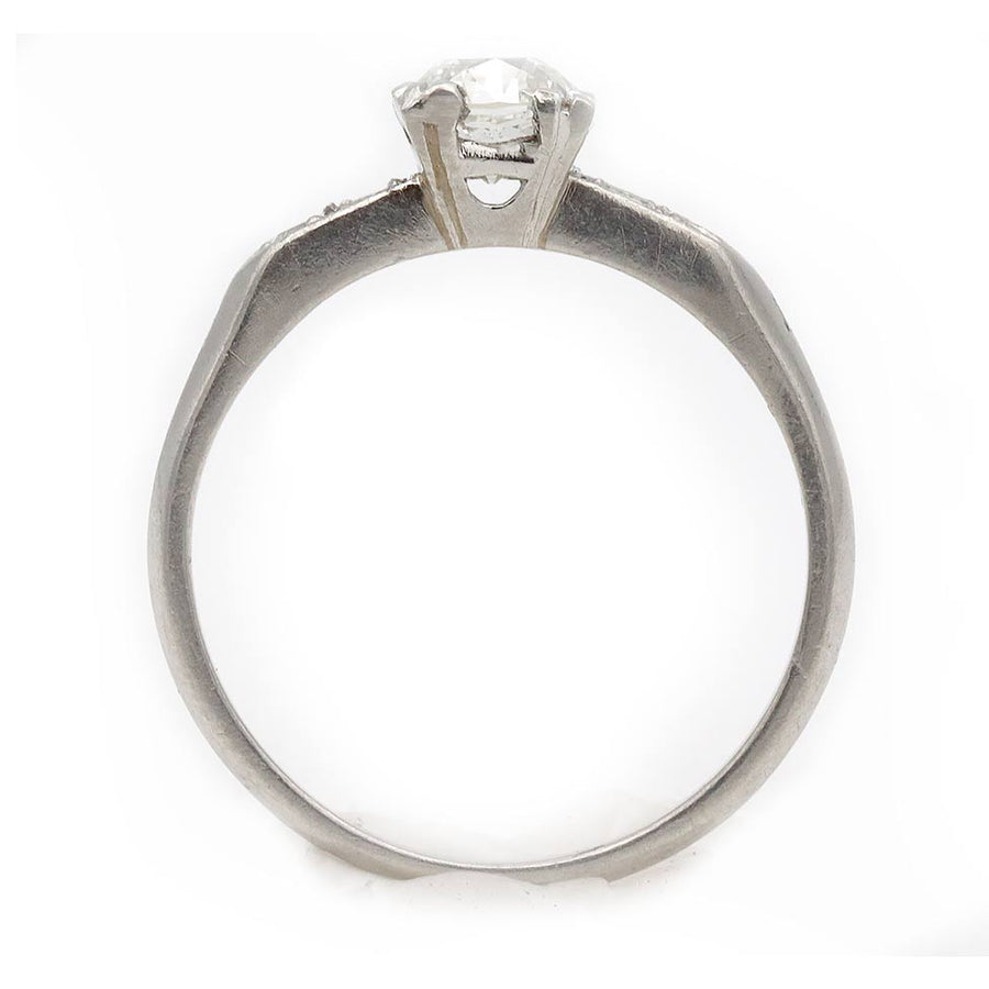The Vindi ring is an authentic vintage diamond engagement ring circa 1930s, signed Lambert Bros. The ring features an AGI certified .85 carat old mine cut diamond of K color, SI2 clarity, residing within trefoil prongs. The diamond is flanked by 4 single cut diamond accents. Beautifully crafted in platinum. A quintessential engagement ring centering a vibrant antique diamond. In very good condition. Signed and stamped "Lambert Brothers".