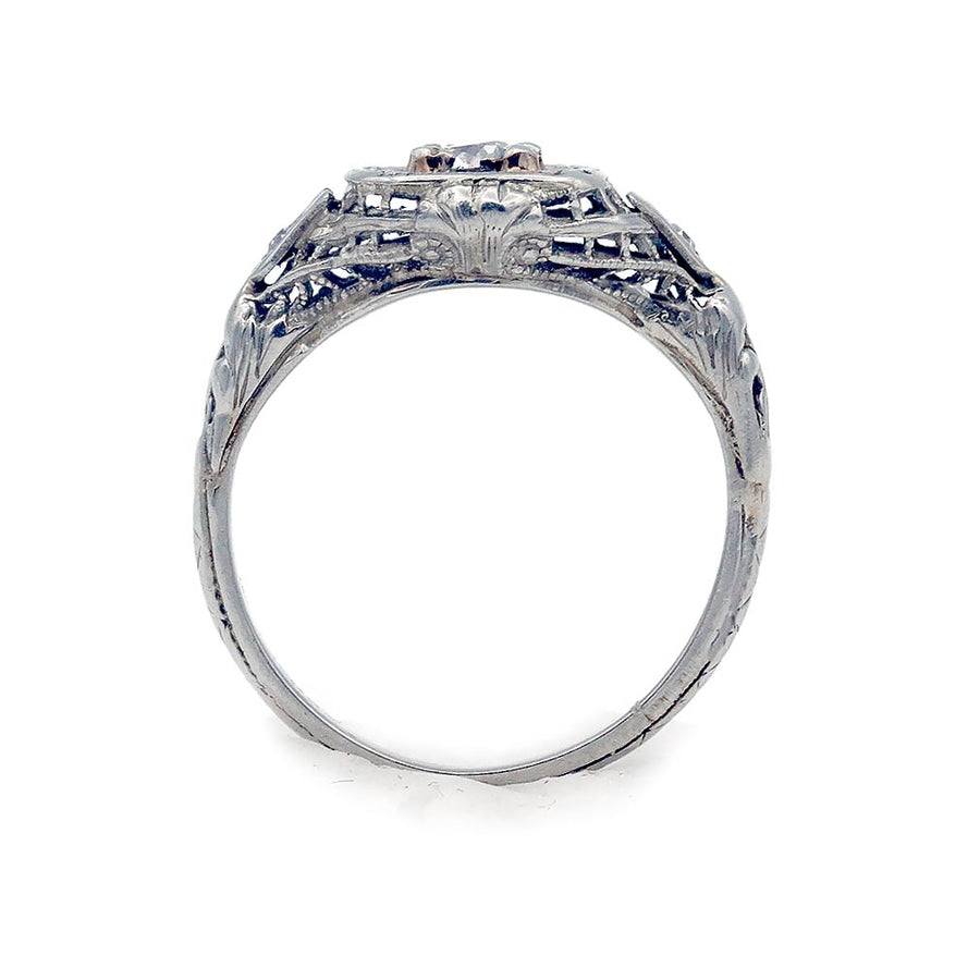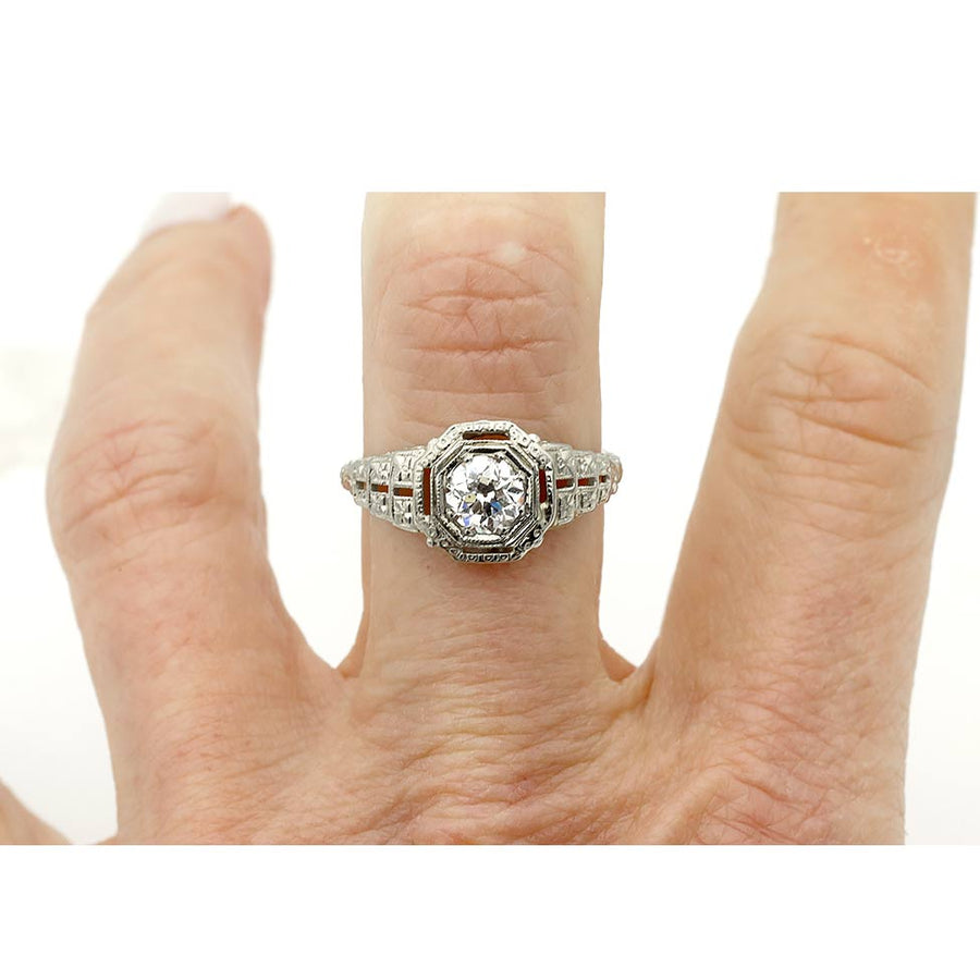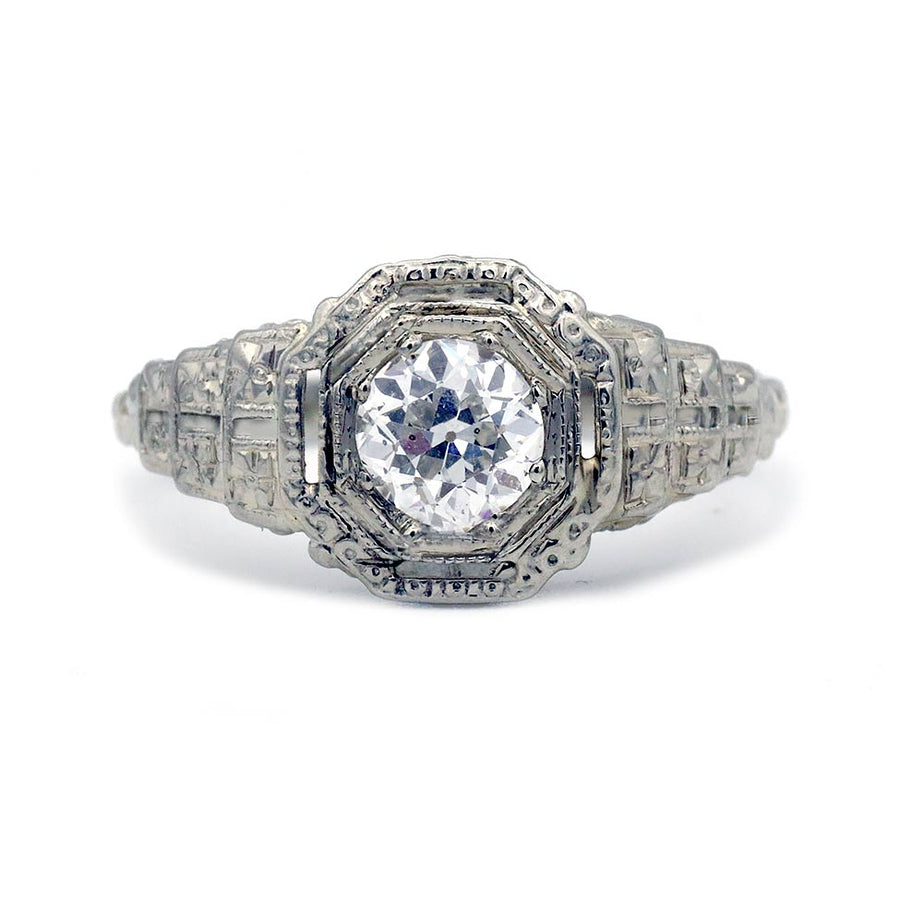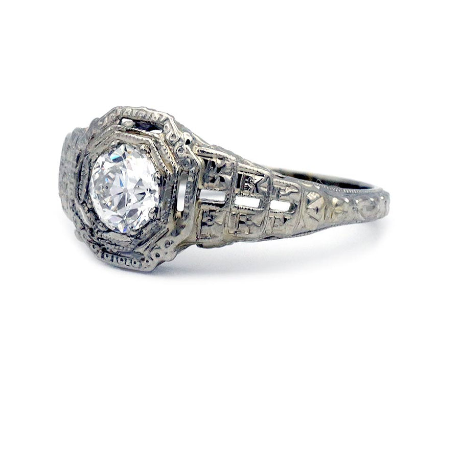 The Eira ring is an authentic vintage engagement ring from the Art Deco era circa 1930's. The ring showcases an AGI certified .60 carat old European cut diamond of G color and VS2 clarity, residing within a two tiered geometric hexagonal frame. Crafted in 18 karat white gold, accentuated with open metal work and filigree engravings. A superb vintage jewel! A favorite engagement ring of ours. In very good condition.
