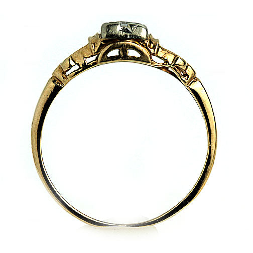 The Arrianna ring is an authentic antique diamond ring circa 1940's. The ring features a dainty .05 carat single cut diamond of H color, SI2 clarity. Crafted in 14 karat two tone gold, white gold atop a rosy yellow gold ring, accentuated with open metal work and a thin fluted band. A lovely delicate ring. In very good condition.