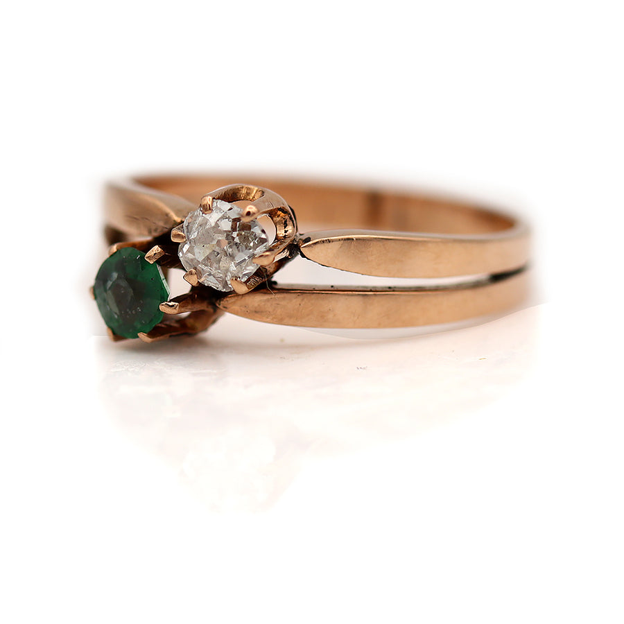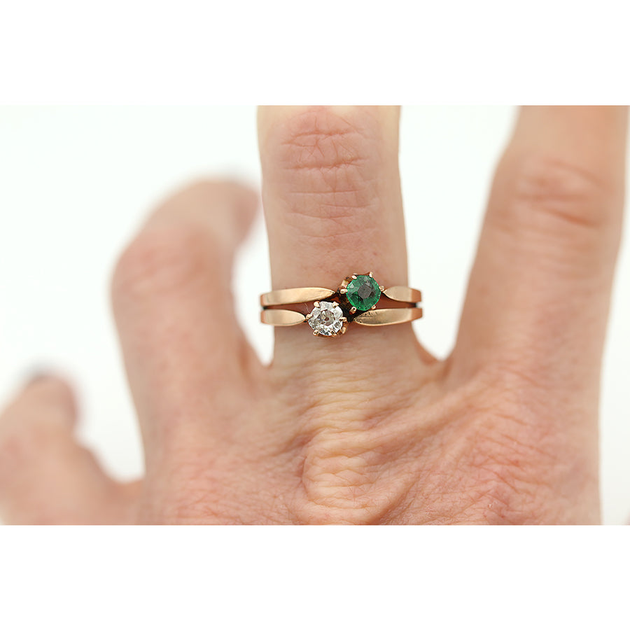 The Aimmee ring is an authentic antique engagement ring, circa 1920's. This ring features a .30 carat old mine cut alongside a .30 carat garnet doublet. Beautifully crafted in 10 kt rose gold, this ring is perfect to wear alone or stack with other vintage rings. In good condition. (Old mine cut diamond has tiny bruises).