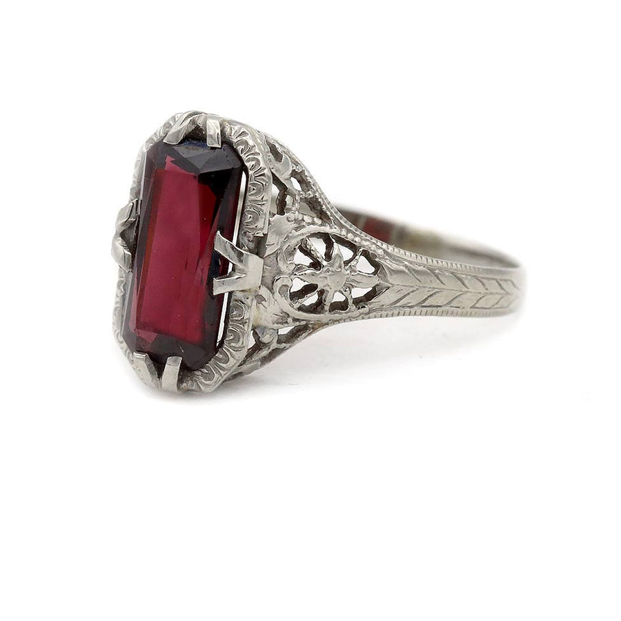 The Borra ring is an authentic Art Deco engagement ring from the 1930s, centered with a natural 1.50 carat emerald-cut red garnet. Crafted in 14 karat white gold, the setting features graceful open metalwork and delicate filigree along the shoulders, highlighting the bold geometry of the Art Deco era. A striking alternative engagement ring with strong period character, preserved in very good condition.