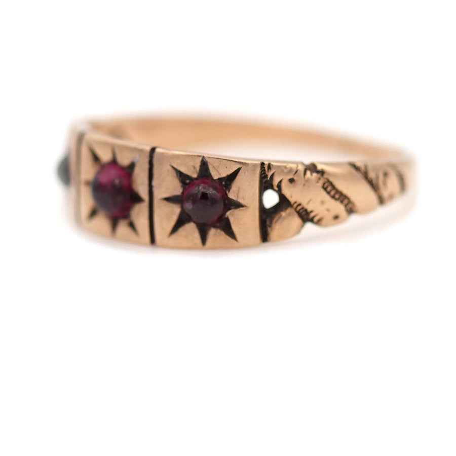 The Shore ring is an authentic vintage garnet wedding ring from the Victorian era, circa 1900's. This ring features two (2) natural purple cabochon garnets and one (1) natural red cabochon garnet weighing .30 ctw. Beautifully crafted in 10 kt rose gold, and accentuated with delicate filigree engravings, this is a beautiful gemstone band in very good condition.
