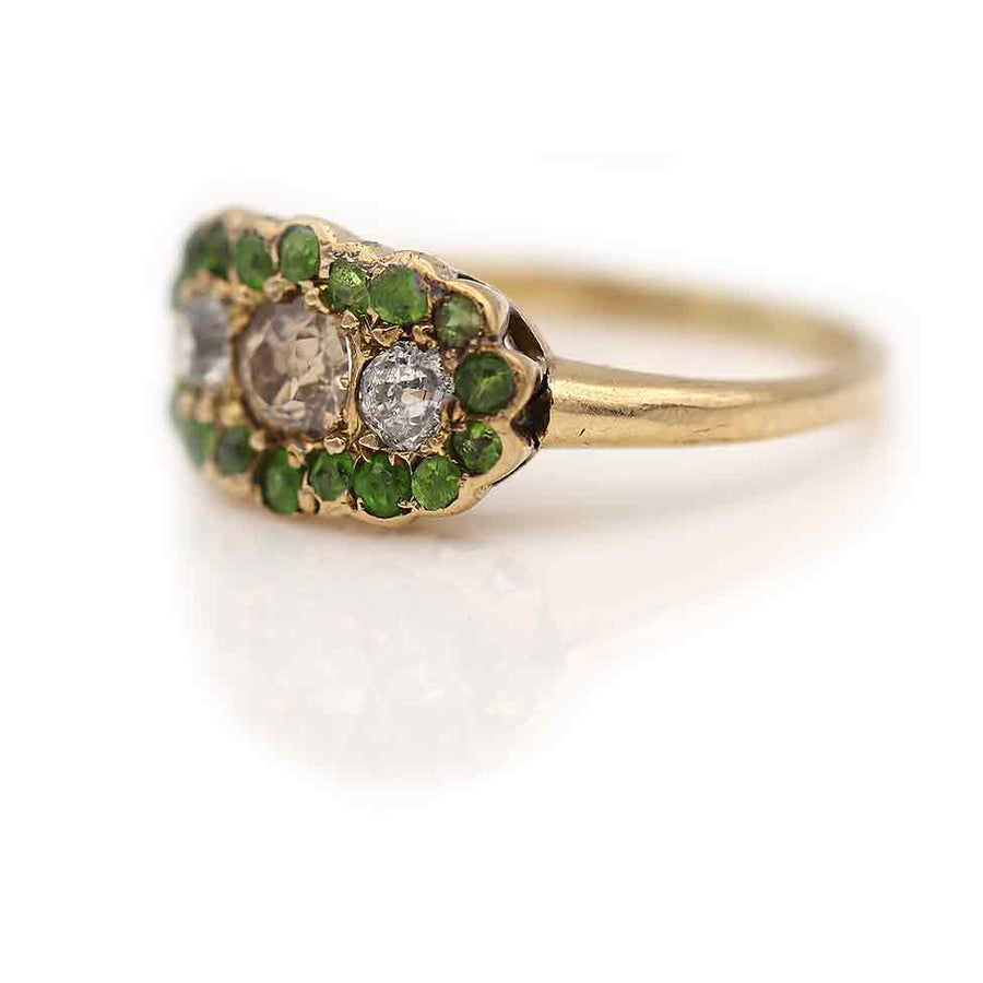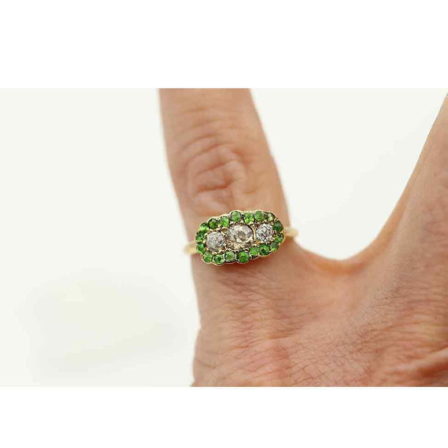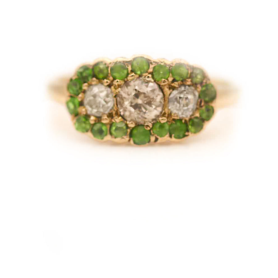 The Warrick ring is an authentic antique engagement ring, circa 1920's featuring a .25 carat natural center champagne old mine cut diamond flanked by two (2) old mine cut diamond accents, weighing .20 carat. The old mine cut diamonds are surrounded by a delicate cluster of eighteen (18) natural round cut demantoid garnets. Beautifully crafted in 14 kt yellow gold, this ring is stunning and very hard to find. In very good condition
