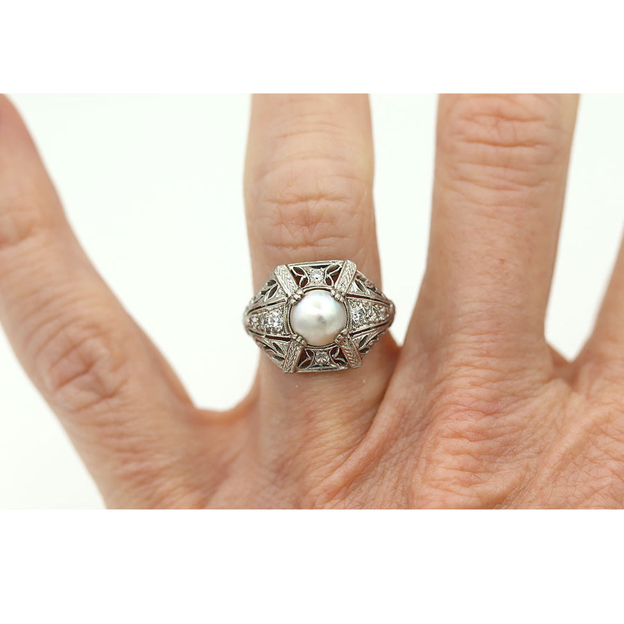 Edwardian 1.40 CTW Pearl Old Mine Cut Diamond Platinum Antique Engagement Ring