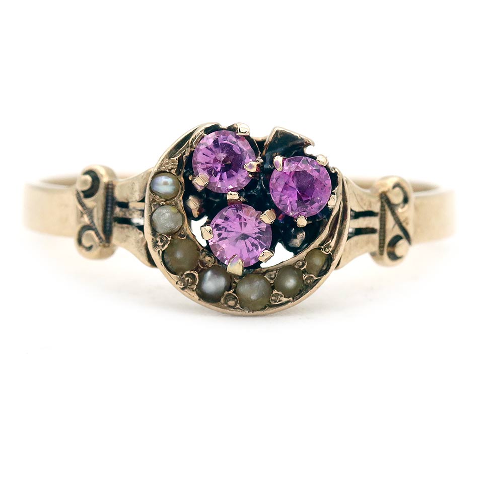 The Coleman ring is an authentic Victorian pink sapphire engagement ring from the early 1900s. This unique ring features three natural pink sapphires, weighing approximately .60 carats in total, framed by seven original seed pearls. Set on a delicate split shank and handcrafted in 10 karat gold, the ring is finished with fine milgrain and filigree engraving. A softly detailed Victorian gemstone ring in very good condition. Size 7.5