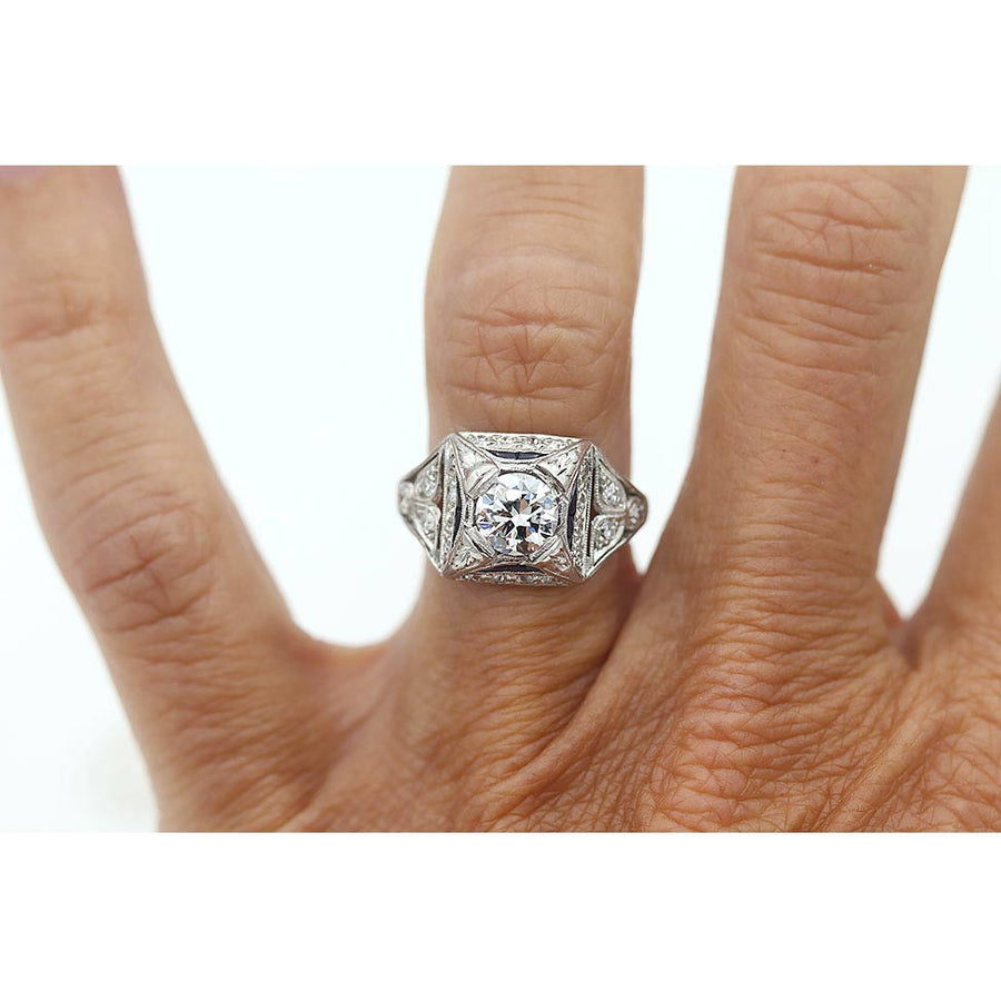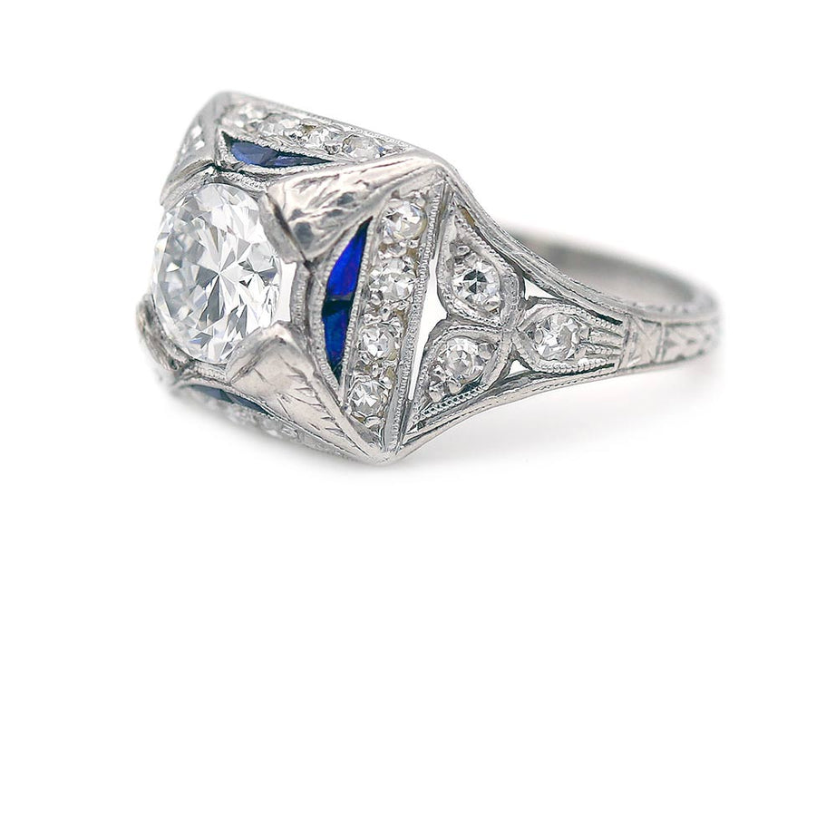 Vintage 1.28 CTW European Cut Diamond Sapphire Art Deco Engagement Ring GIA E/VS2