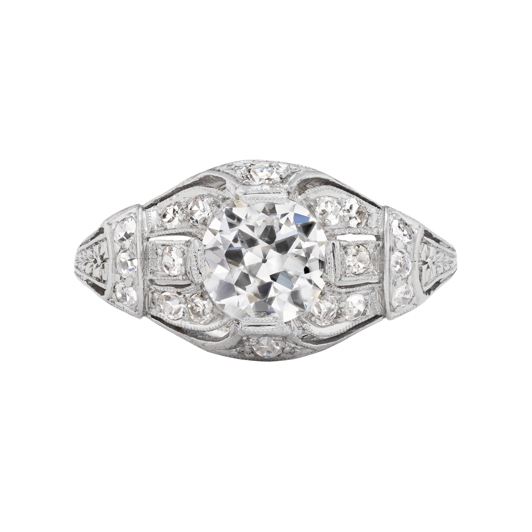 The Rosalind ring is an authentic vintage engagement ring from the Art Deco era circa 1930s. The ring features a 1.06 carat GIA certified old European-cut diamond of J color, SI2 clarity. The diamond is surrounded by 18 single cut diamond accents. Hand fabricated in platinum, accentuated with open metal work, milgrain and intricate filigree engravings. Rare, stunning and one of a kind! In excellent condition.