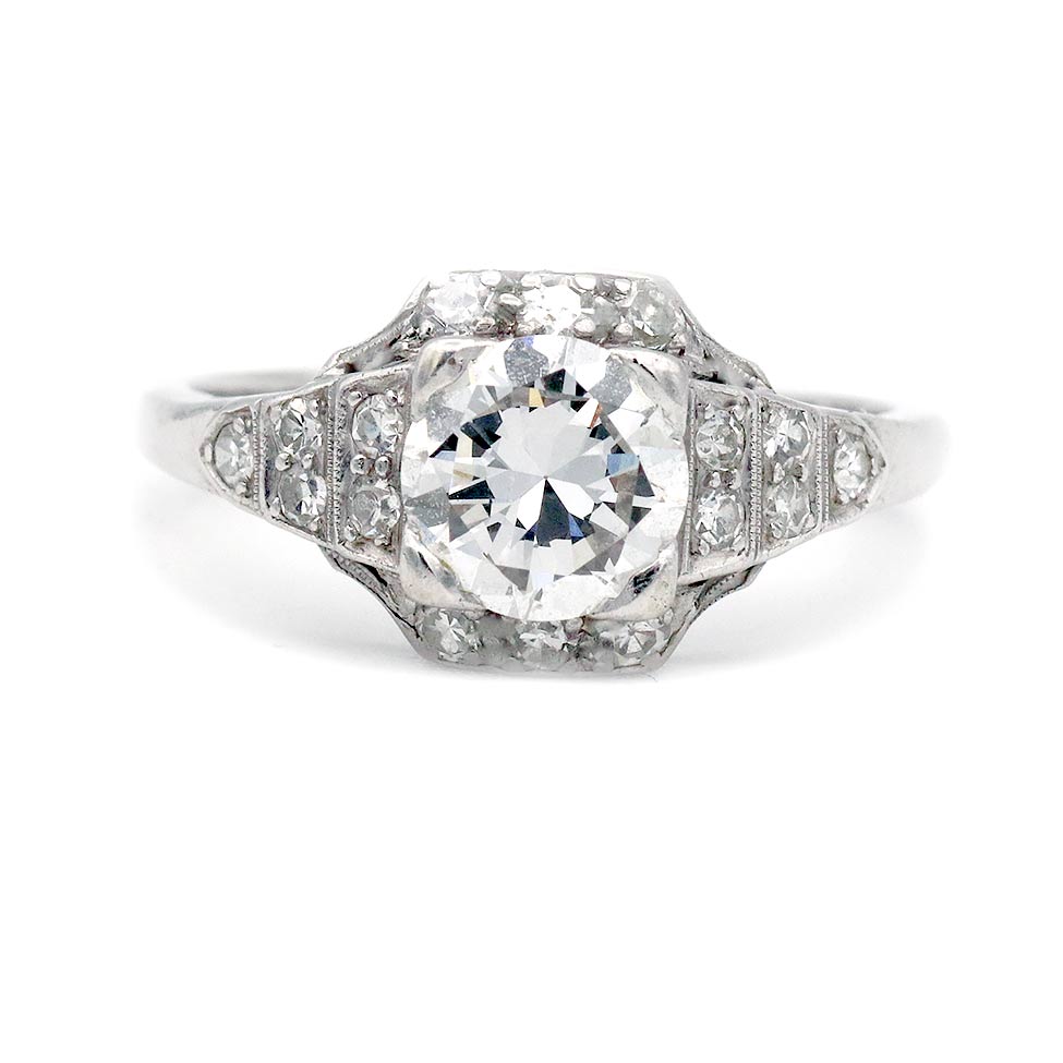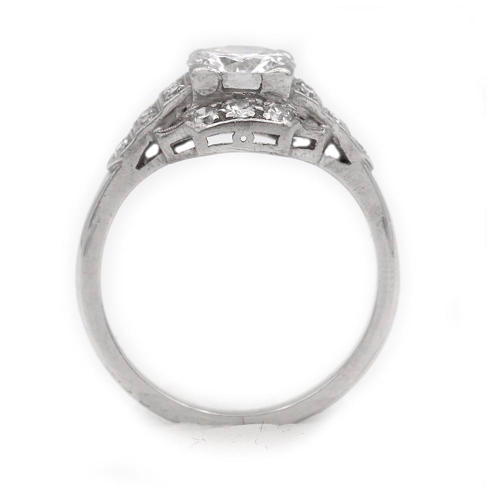 The Jennifer ring is an authentic Art Deco engagement ring dating to the 1920s. At its center is an AGI-certified 1.01 ct Old European cut diamond, graded G color and VS2 clarity. The center stone is surrounded by 6 single-cut diamond accents and further enhanced by 10 tiered single-cut diamonds, creating depth and refined symmetry. Crafted in platinum and finished with delicate milgrain engraving characteristic of the Art Deco period, this elegant engagement ring is preserved in very good vintage condition.