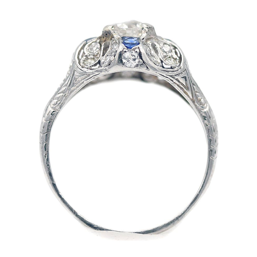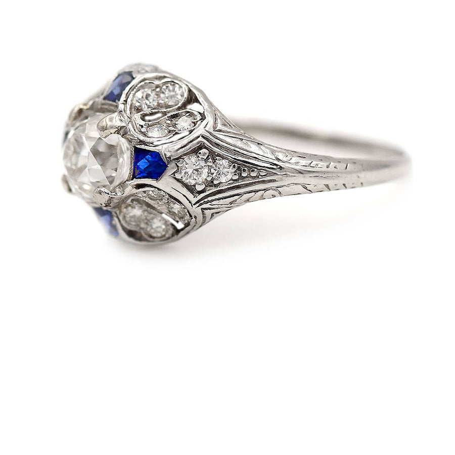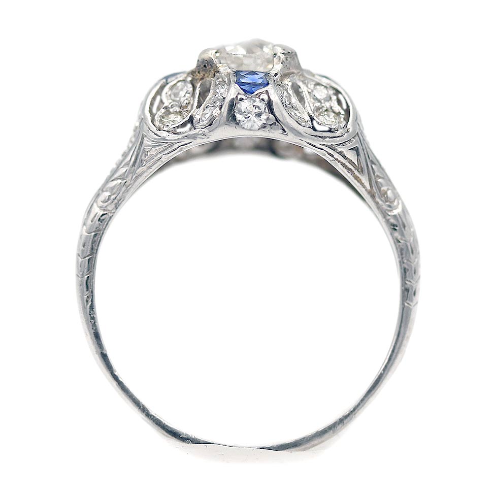 The Melda ring is an authentic Art Deco engagement ring dating to the 1930s. It features a .70 carat Old Mine cut diamond graded I color and VS2 clarity, set in a four-prong platinum setting and accented by four bullet-cut synthetic sapphires. The design is further detailed with twenty-two Old Mine and single cut diamond accents, along with open metalwork and fine filigree engravings typical of the Art Deco period. This vintage engagement ring is offered in very good condition.