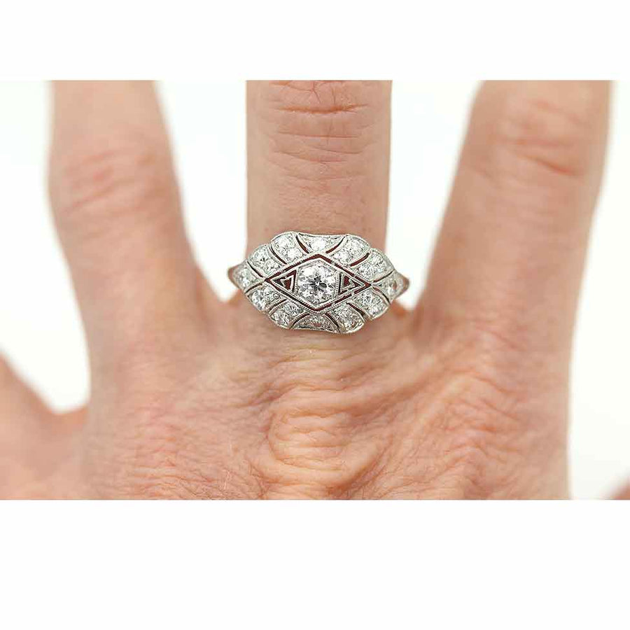 The Goldpiroul ring is an authentic vintage engagement ring from the Edwardian era, circa 1920s. The ring features a .35 carat old European cut diamond of F color and VS2 clarity, residing within a geometric square frame, surrounded by twenty (20) old mine cut diamond accents. Beautifully crafted in platinum, and accentuated with delicate milgrain engravings. An Edwardian jewel! In very good condition. Magnifique!