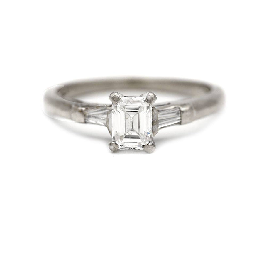 The Camie ring is an authentic vintage three-stone engagement ring dating to the 1970s. At its center is a .55 carat AGI-certified emerald-cut diamond, graded H color and VS2 clarity, flanked by two tapered baguette diamond accents that emphasize clean lines and symmetry. Beautifully handcrafted in 14 kt white gold, this elegant estate ring reflects the refined, architectural style of the era. A classic and versatile vintage piece, offered in very good condition.