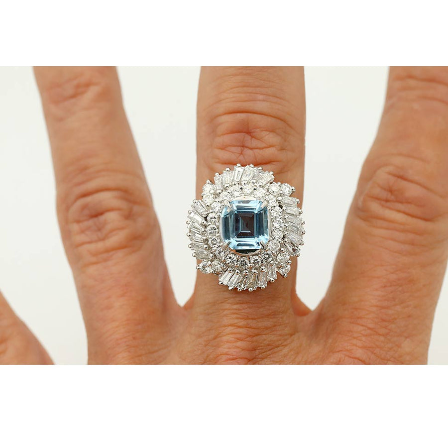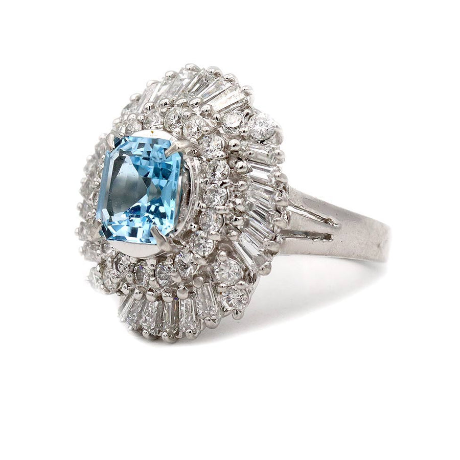 The Fischer ring is a stunning 1980s vintage aquamarine ballerina ring featuring a natural 2.10 carat vintage natural square cut aquamarine surrounded by fifty (50) baguette and round cut diamond accents, weighing approximately 2.20 carats. Beautifully crafted in platinum, this is a beautiful alternative ballerina ring that is in very good condition. Perfect to wear on either hand. The ring measures 19.7 mm at the top, tapering to 5.0 mm and 2.8 mm at the bottom.