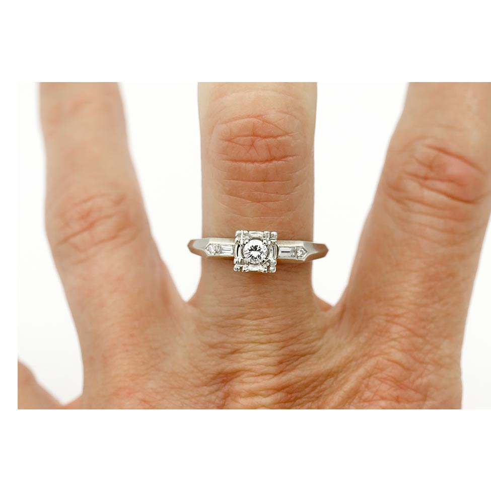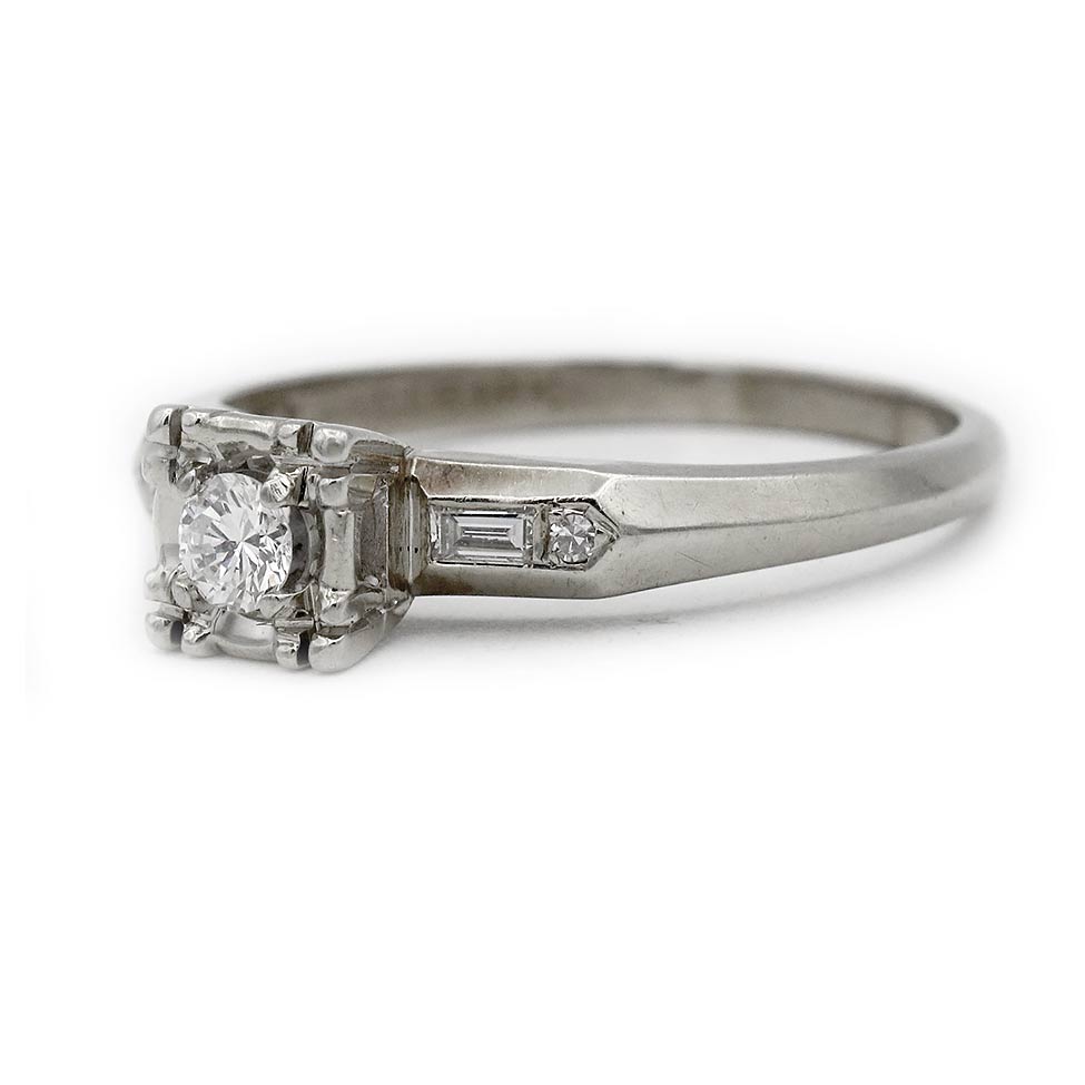 The Rachelle ring is an authentic antique ring from the 1940's. The ring centers a bright white, illusion set .20 carat transitional cut diamond of E color, VS1 clarity. The diamond is flanked by 2 straight baguette diamonds and 2 single cut diamond accents. Crafted in 18 karat white gold. A sweet, charming little gem, in excellent condition.