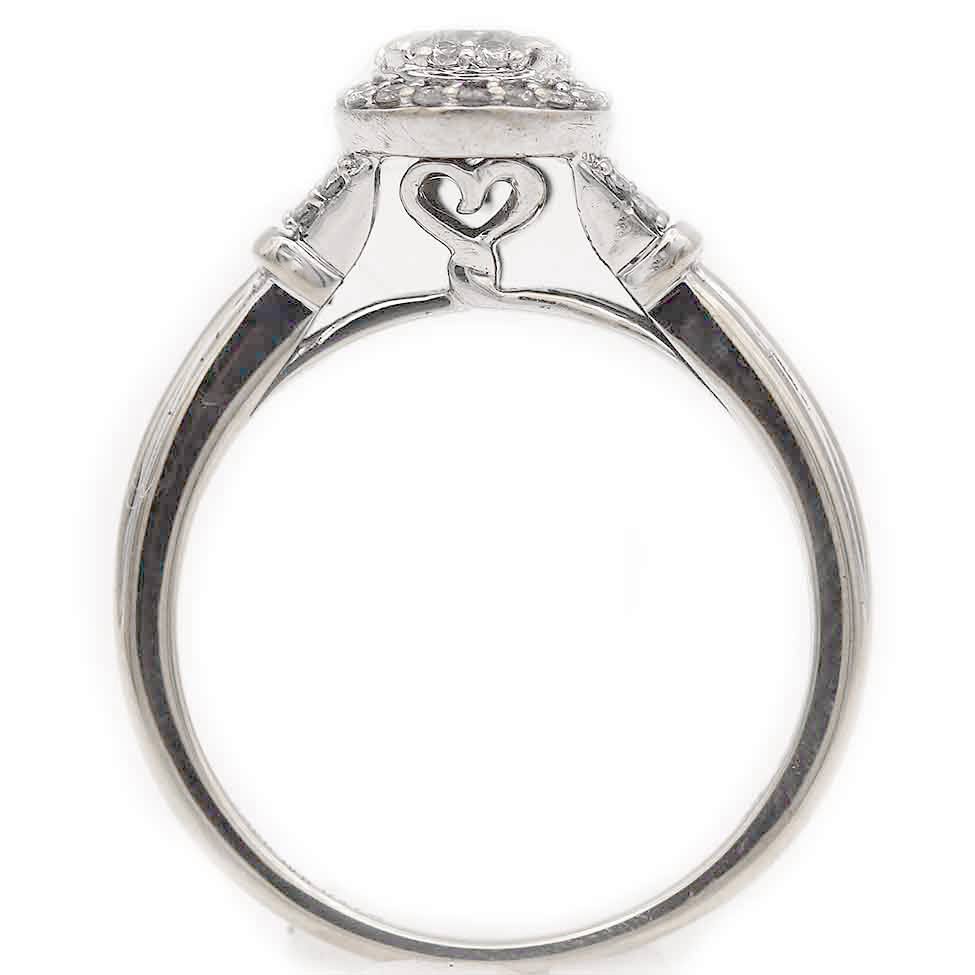 The Phoeba ring is an authentic vintage halo engagement ring from the 1980s, centered with a .15 carat brilliant cut diamond graded F color and I1 clarity, set in knife-edge prongs. The center stone is framed by a double halo of twenty-eight micro-pavé round cut diamonds and eight brilliant cut diamond accents, bringing the total diamond weight to approximately .48 carats. Crafted in 10 karat white gold, the design is finished with a delicate heart motif. A sweet vintage halo ring in good condition.