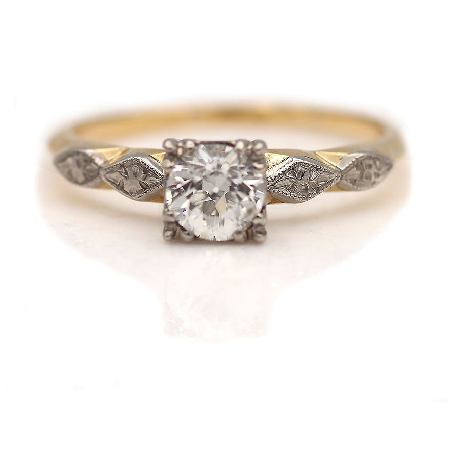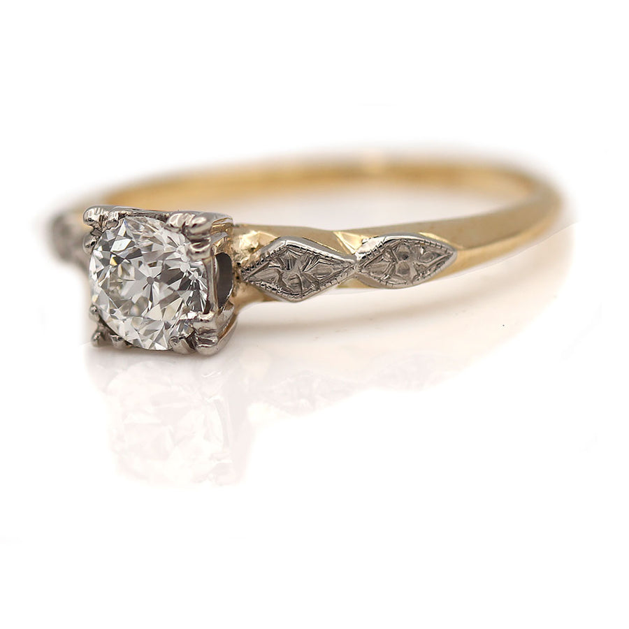 The Milan ring is an authentic vintage engagement ring, circa 1940s, featuring a .75 carat old mine cut diamond accompanied by an AGI report stating I color and SI2 clarity. Beautifully crafted in 14 kt two tone gold, and accentuated with original filigree engravings. Sweet in every way, this ring is in very good condition. Magnifique!