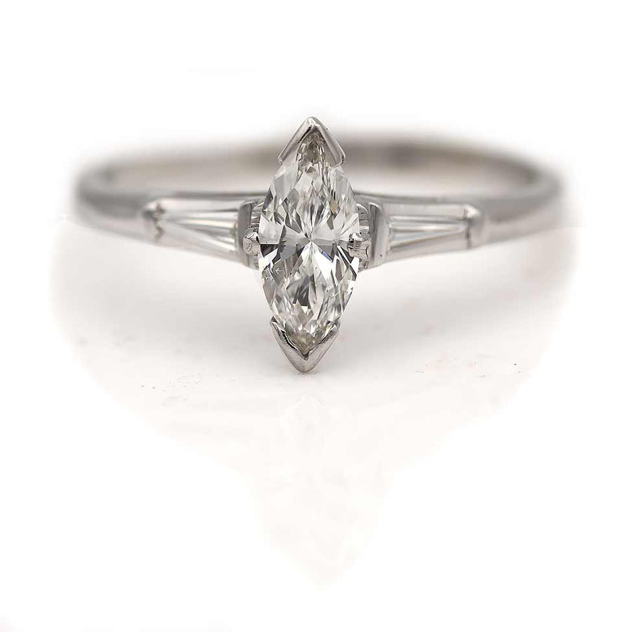 The Enchantment ring is an authentic vintage diamond engagement ring, circa 1970s. This lovely three stone diamond ring features a glittering .71 carat marquise diamond accompanied by a GIA report stating F color and SI2 clarity, flanked by two (2) tapered baguette diamonds. Crafted in platinum, this is a timeless three stone ring.