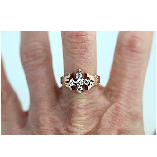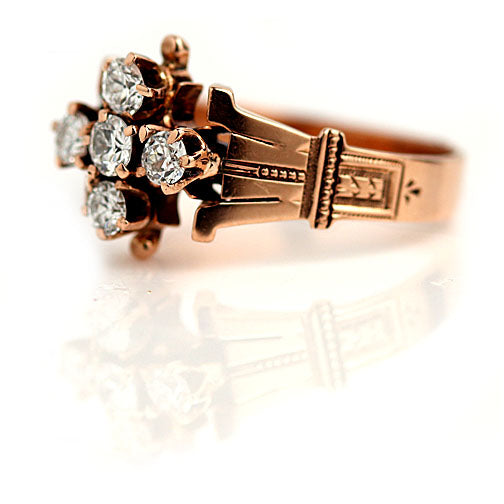 The Ambrosia ring is an authentic vintage diamond engagement ring circa 1900s. The ring showcases 5 old European cut diamonds of F color, VS2 clarity, residing within knife edge prongs. Crafted in gleaming 14 karat rose gold, accentuated with beautiful filigree engravings. A bold, timeless ring, that is perfect to wear on either hand. Magnifique! In excellent condition.