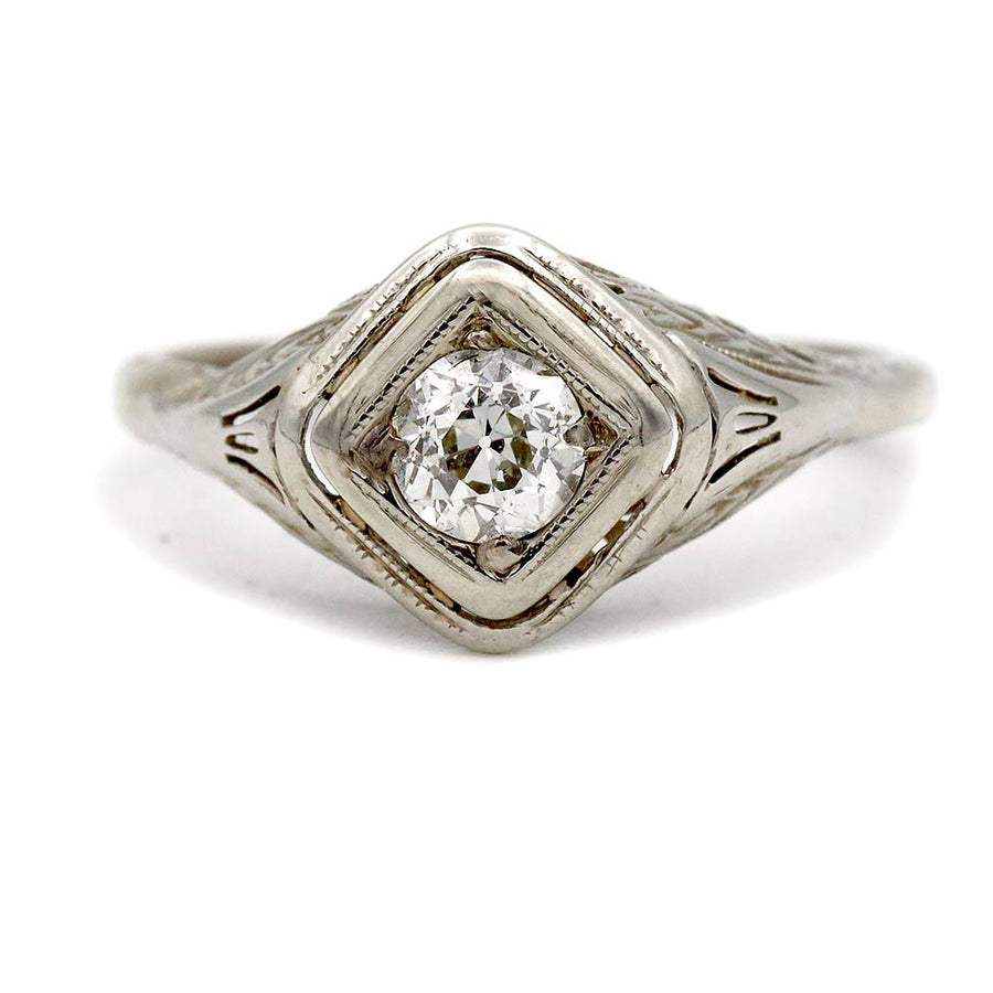 The Elodie ring is an authentic antique engagement ring circa 1930's. The ring features a bright-white .35 carat old European cut diamond of G color, VS2 clarity, residing in a geometric 4 sided frame. Crafted in the 1920's in a 14 karat white gold, accentuated with open metal work and milgrain engravings. Petite, pretty and in good condition.