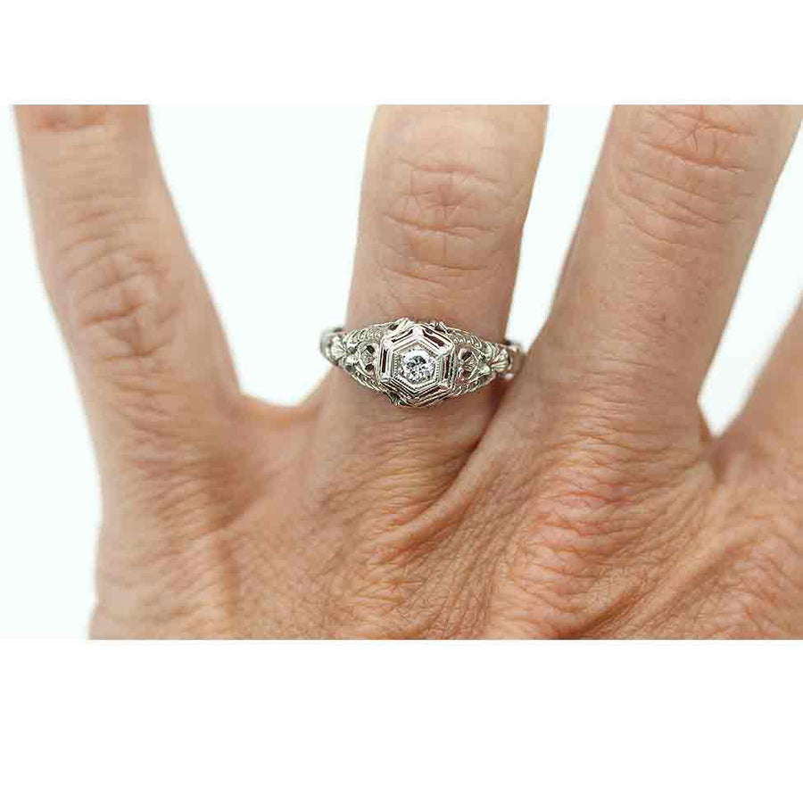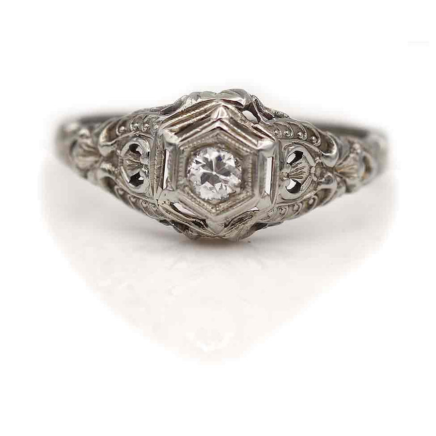 The Markie ring is an authentic vintage diamond engagement ring from the Art Deco era, circa 1930's. This ring showcases a .15 carat old European cut diamond of F color and VS1 clarity, residing within an 18 kt white gold geometric hexagonal frame. Beautifully accentuated with delicate milgrain and filigree engravings. A magnificent vintage piece, in very good condition.
