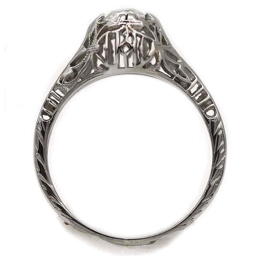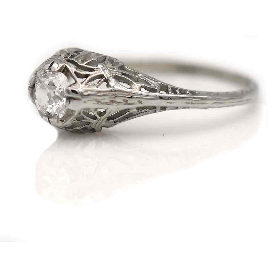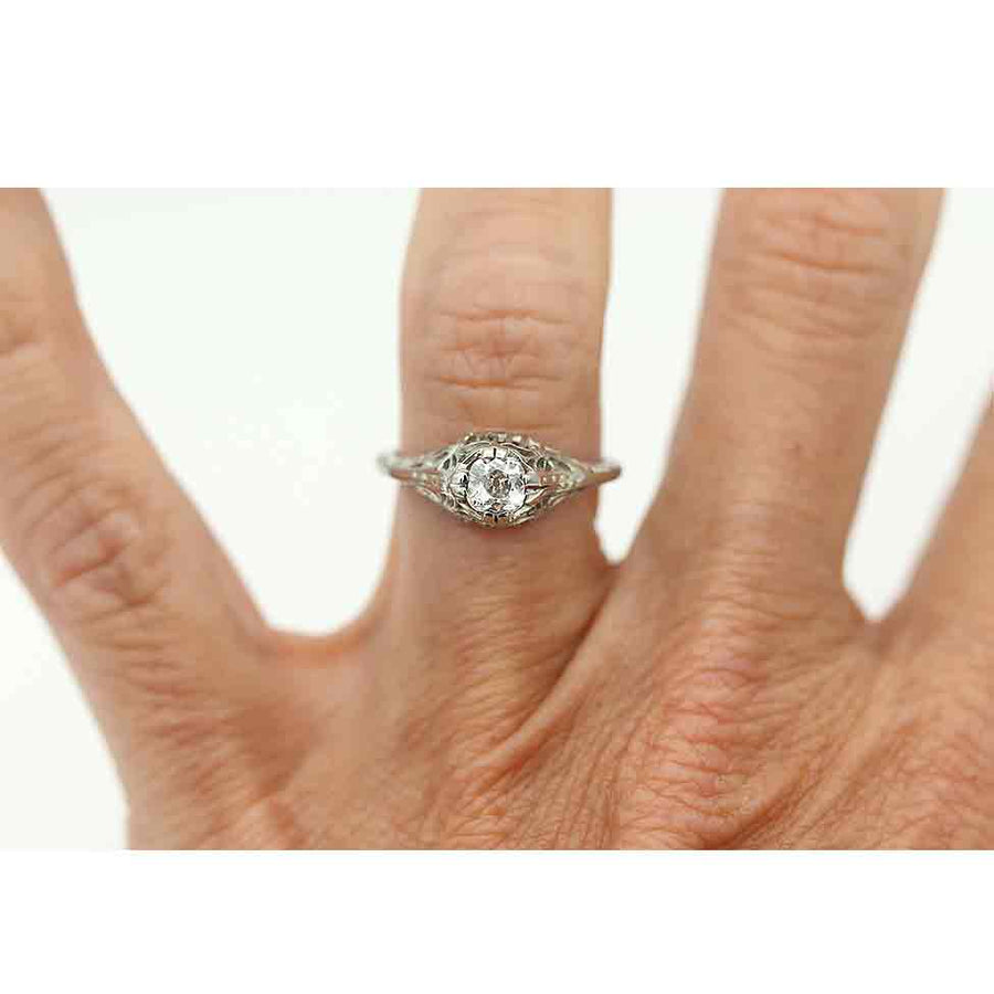 The April ring is an authentic vintage diamond engagement ring from the Art Deco era, circa 1930's. This ring showcases a .35 carat old mine cushion cut diamond of H color and SI2 clarity. Beautifully crafted in 18 kt white gold, and accentuated with delicate filigree and milgrain engravings. A beautiful piece, in very good condition.