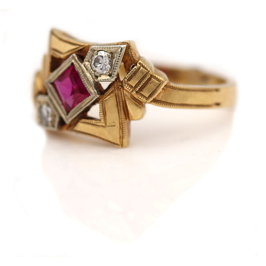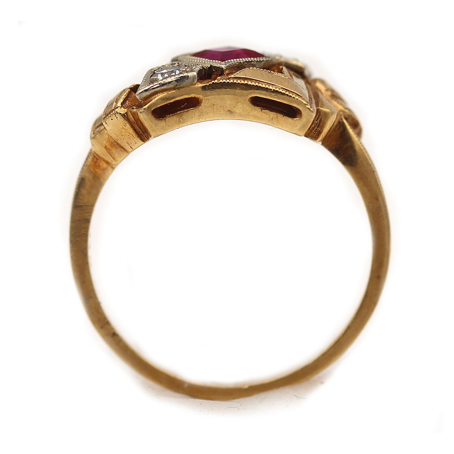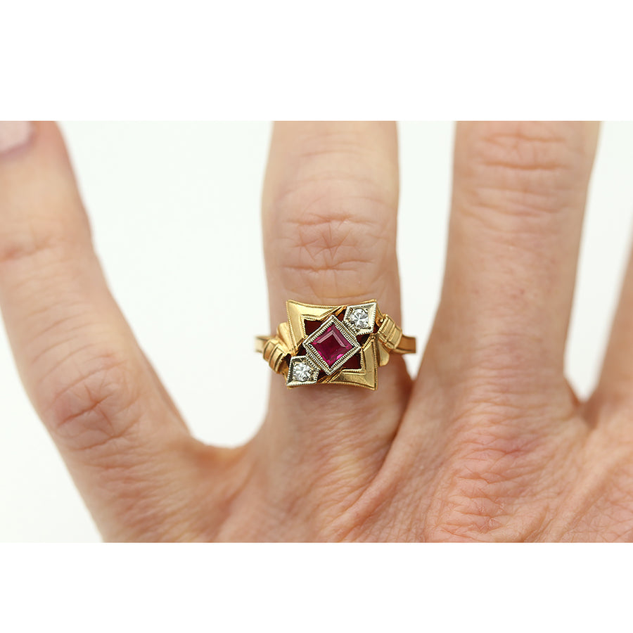 The Matash ring is an authentic Victorian engagement ring, circa 1900s. This ring features a .25 carat synthetic square cut ruby residing in a square frame, flanked by two (2) large single cut diamond accents. Beautifully crafted in 14 kt yellow gold, accentuated with delicate filigree and milgrain engravings. As sweet as can be. A perfect cocktail ring to wear on either hand.