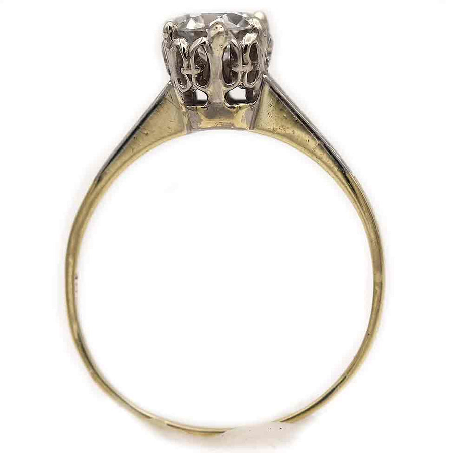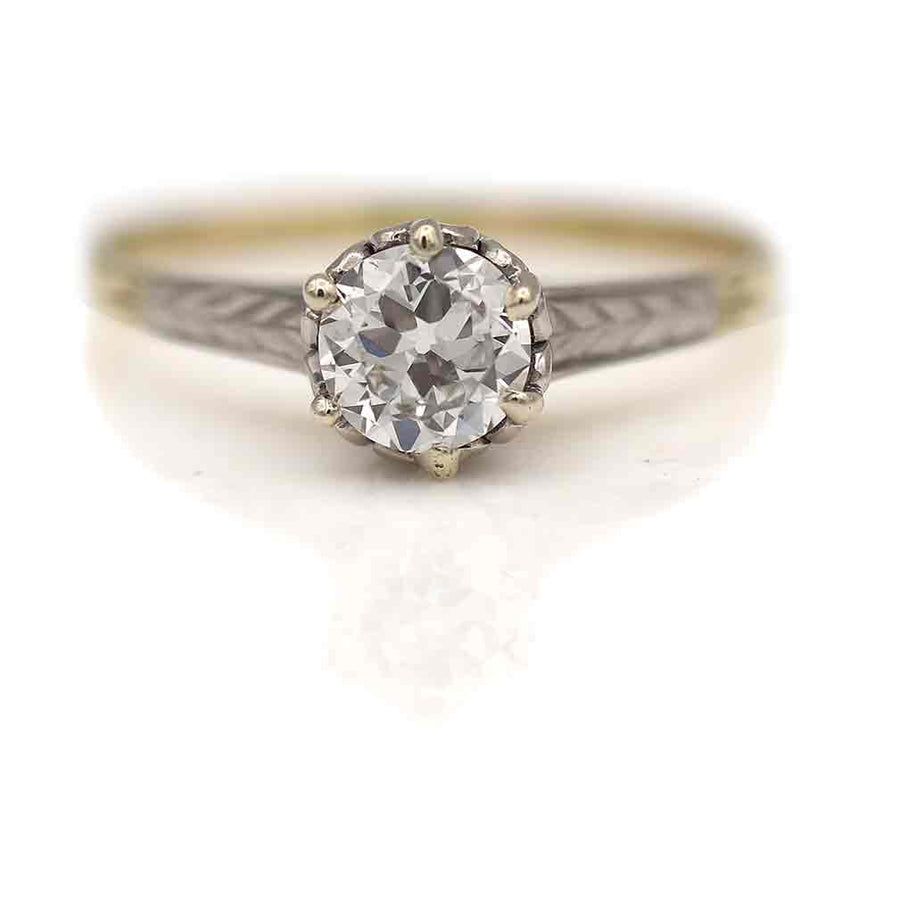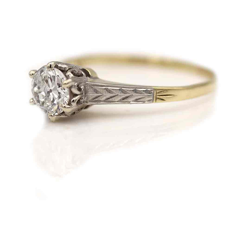 The Sunnyside ring is an original antique engagement ring, circa 1920s. The ring features a GIA certified .69 carat old European cut diamond with E color and SI2 clarity. This diamond stands tall and proud in a 10 kt two tone gold setting, accentuated with milgrain and filigree designs. A lovely antique piece. In very good condition.