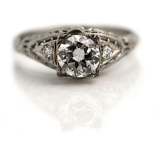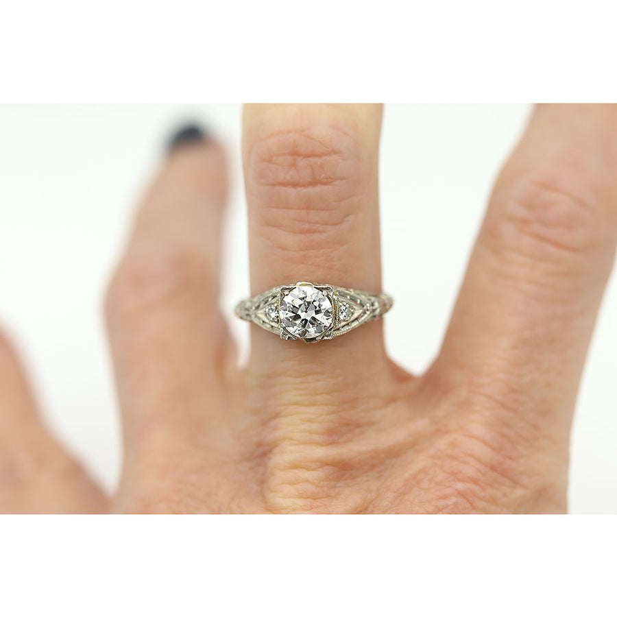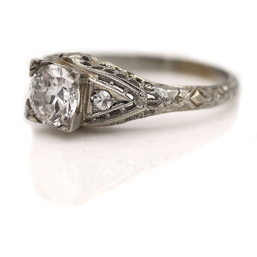 The Megs ring is an authentic vintage engagement ring from the Art Deco circa 1930s. The ring showcases a high-quality AGI certified .90 carat old European cut diamond of F color, SI2 clarity. The diamond is flanked by 2 triangular milgrain framed single cut diamond accents. Beautifully handcrafted in 18 karat white gold, accentuated with open metal work and filigree engravings. A timeless, superb ring, in excellent condition.