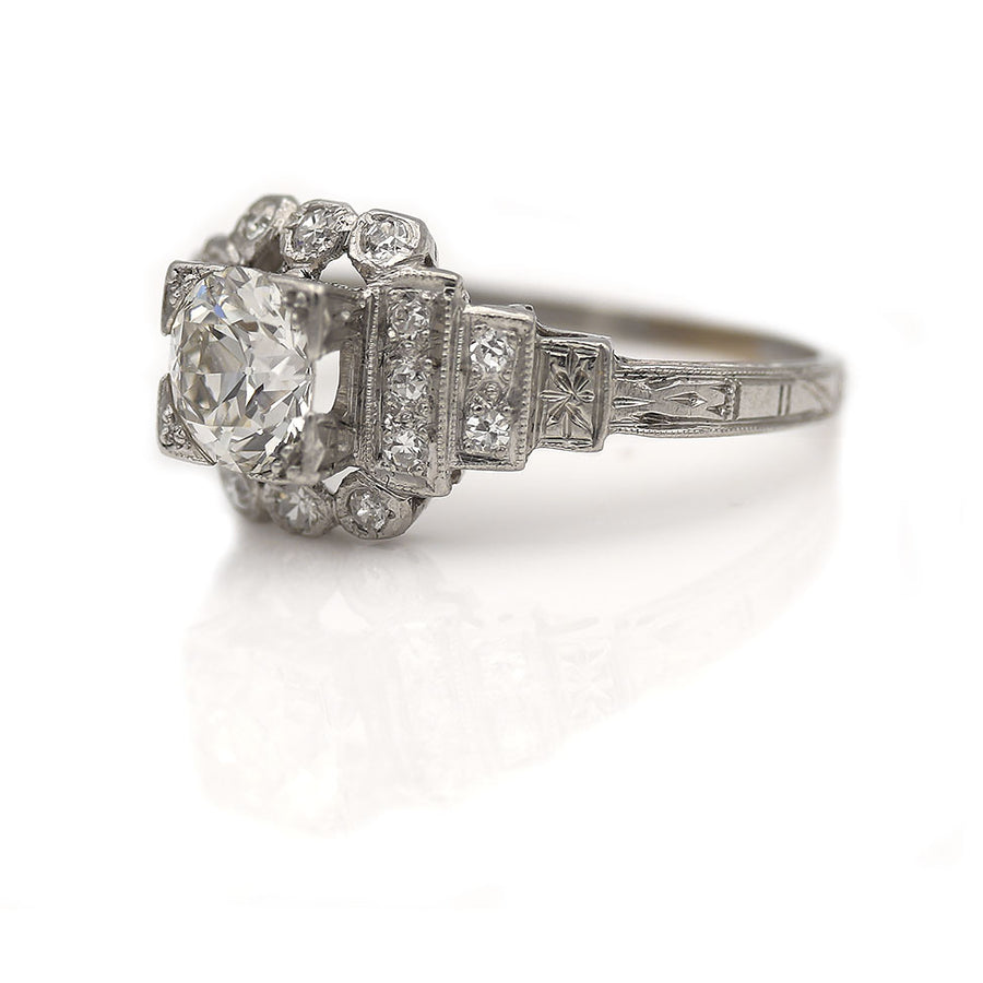 Art Deco 1.44 CTW European Cut Diamond Vintage Engagement Ring with Tiered Side Stones