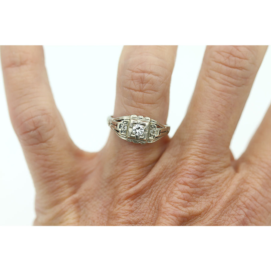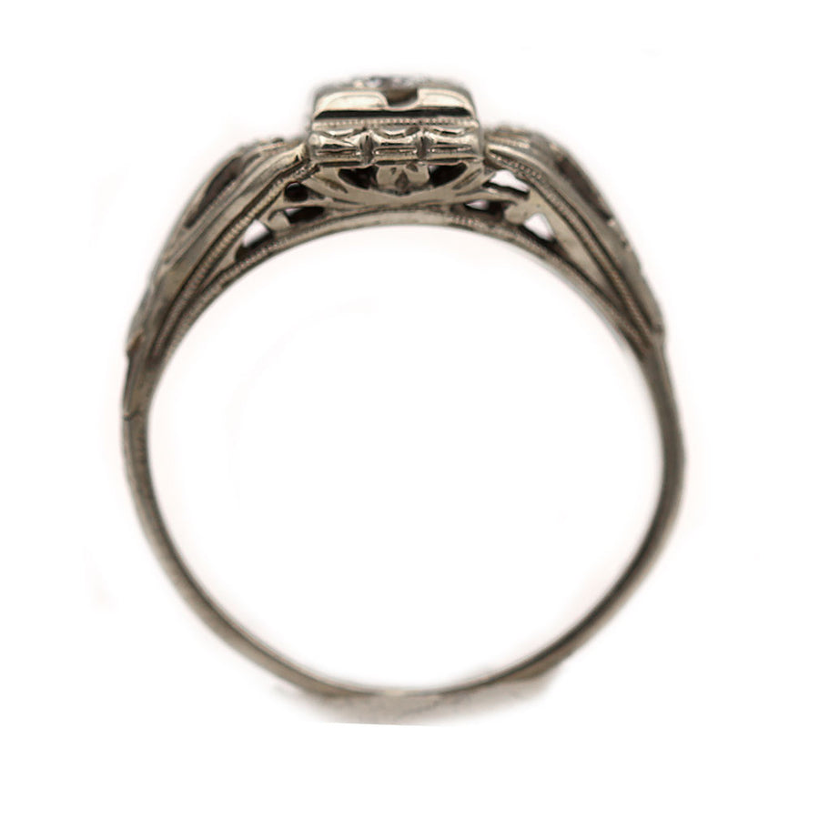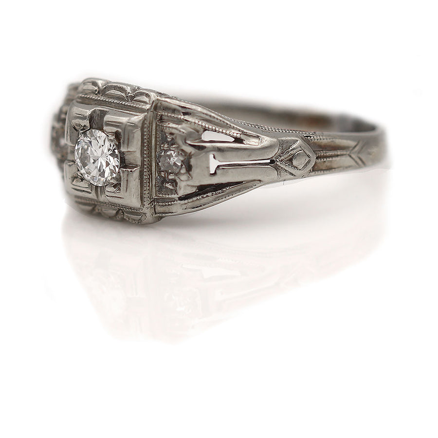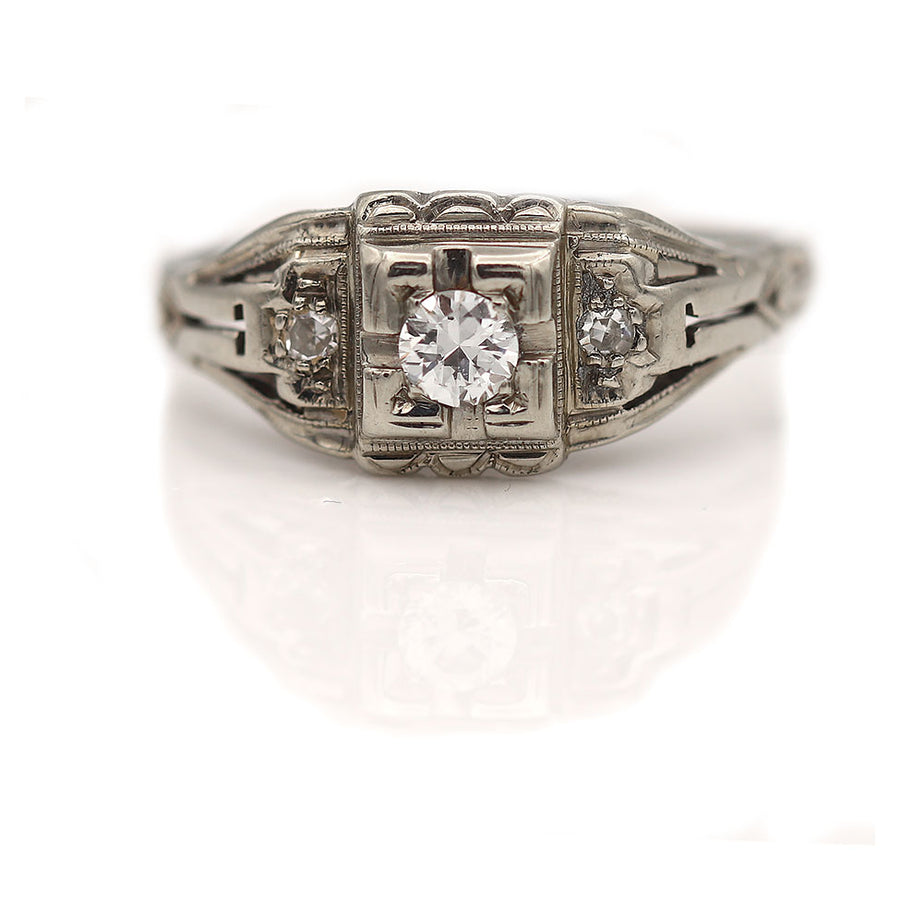 The Merlot ring is an authentic vintage engagement ring from the Art Deco era, circa 1930s. This ring features a .15 carat old European cut diamond of G color and VS1 clarity, residing in a geometric square. The diamond is flanked by two (2) delicate single cut diamond accents, all beautifully crafted in 18 kt white gold, and accentuated with delicate milgrain engravings and open metal work. A lovely, timeless vintage piece! In very good condition.