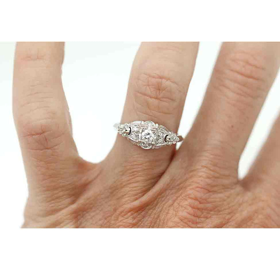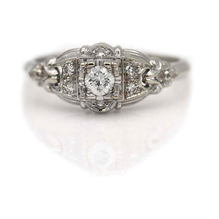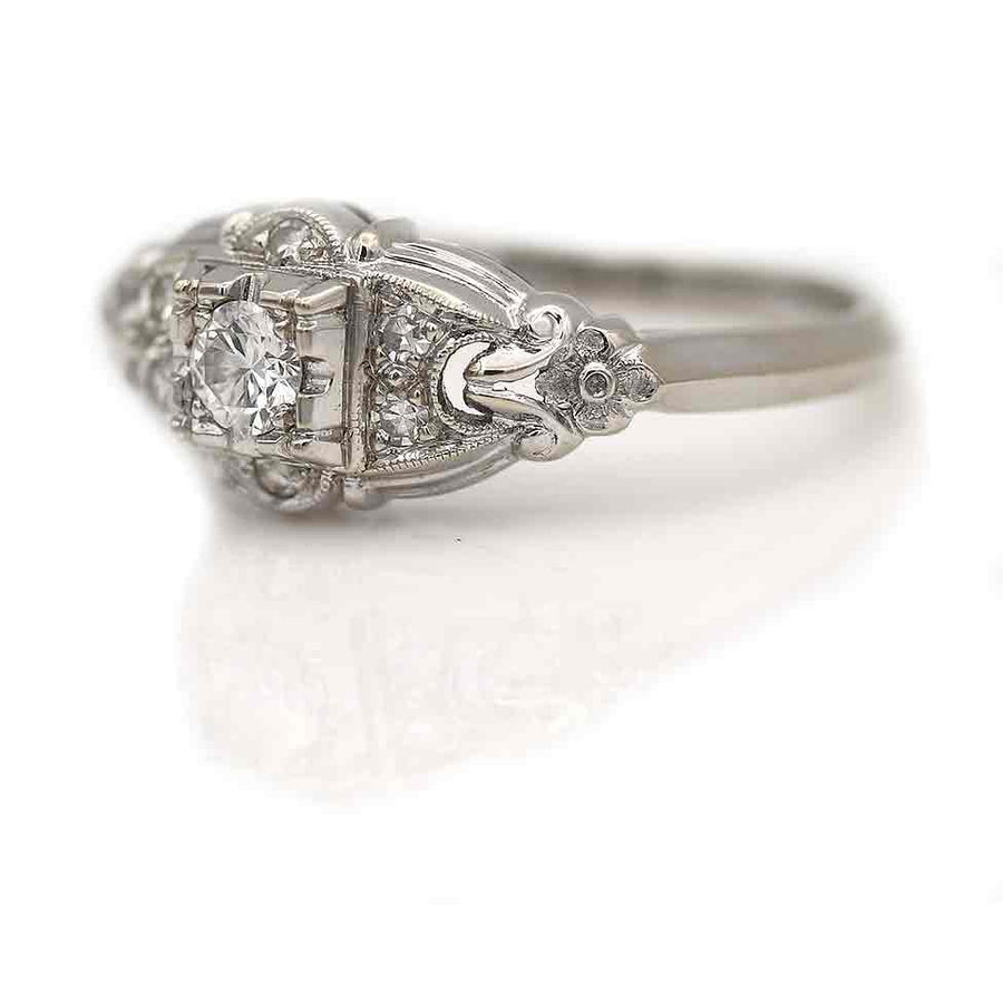 The Stormie ring is an original vintage engagement ring from the Art Deco era, circa 1920's. The ring features a .15 carat vintage old European cut diamond of H color and SI1 clarity, surrounded by six (6) single cut diamond accents. Beautifully crafted in 18 kt white gold, accentuated with delicate milgrain and filigree engravings. An original and sweet Art Deco piece. In very good condition.