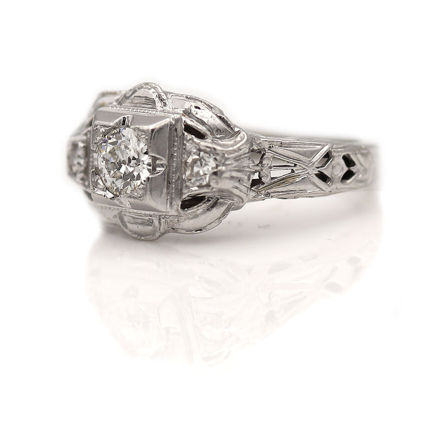 Three Stone Engagement Ring – A slightly larger center stone flanked with two prominent side stones represents a couple’s past, present, and future together. Create your own history by finding that perfect Art Deco engagement ring to symbolize your happily ever after.