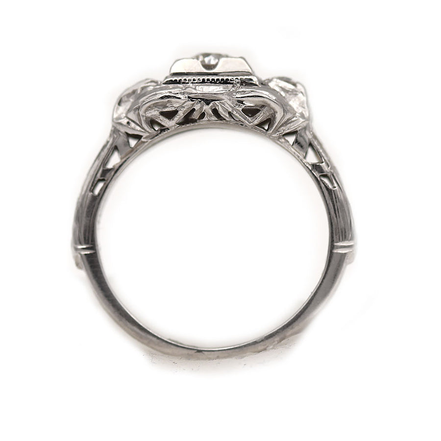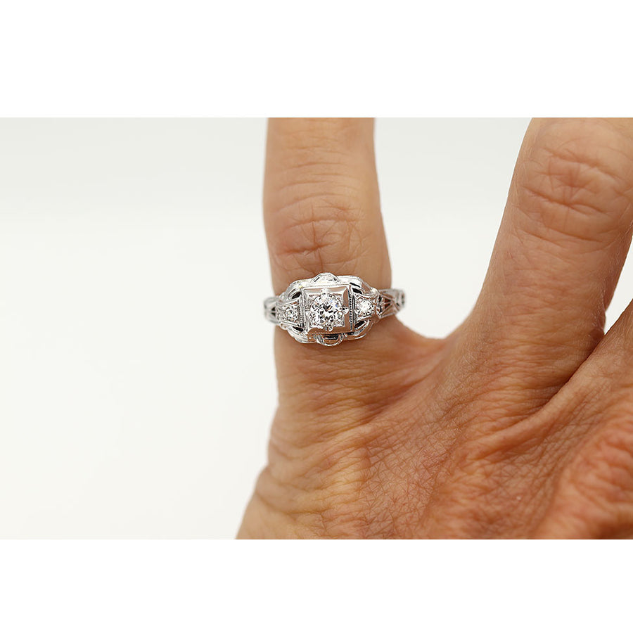 The Bryana ring is an authentic antique diamond engagement ring from the Art Deco era circa 1930s. The ring features a bright-white .25 carat old European cut of H color, VS2 clarity, residing in a geometric square frame. The diamond is flanked by 2 single cut diamond accents. Crafted in 14 karat white gold, accentuated with open metal work and delicate milgrain engravings. A captivating Art Deco jewel. A favorite ring of ours! In very good condition.