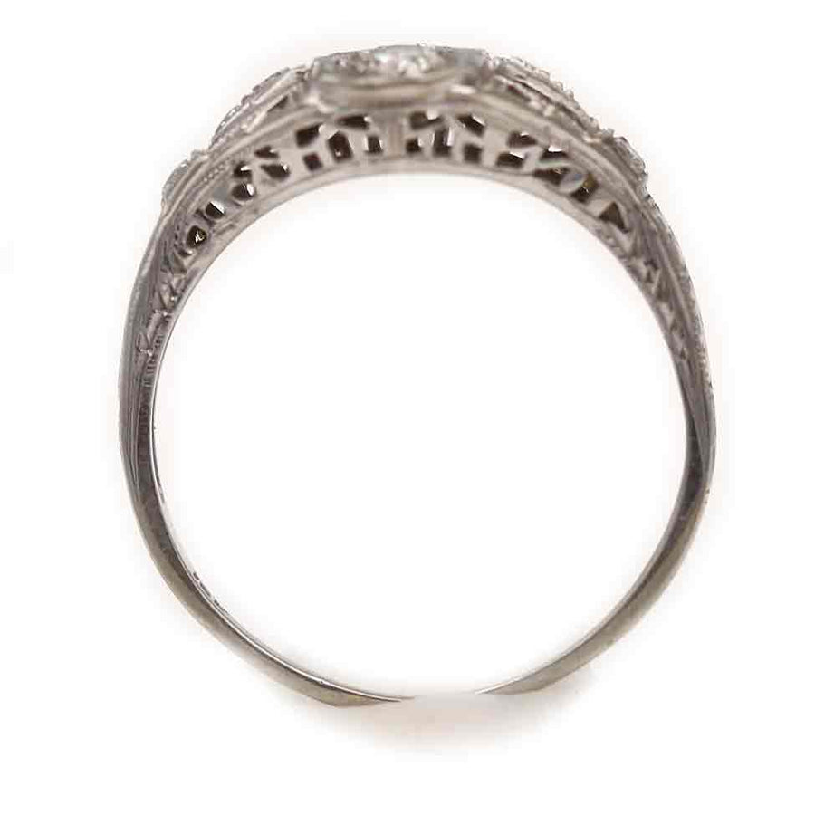 The Lena L ring is an authentic vintage engagement ring from the Art Deco era, circa 1930's. This stunning ring boasts two (2) old European cut diamonds residing in a geometric hexagonal frame. The diamonds are flanked by six (6) single cut diamond accents. Beautifully crafted in 18 kt white gold, accentuated with filigree and milgrain engravings with open metal work. An Art Deco masterpiece! Very hard to find. In very good condition.