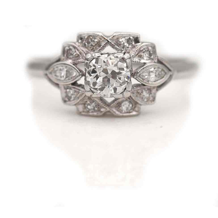Art Deco .51 CTW Old Mine Cut Diamond Antique Halo Engagement Ring w/ Navette Side Stones