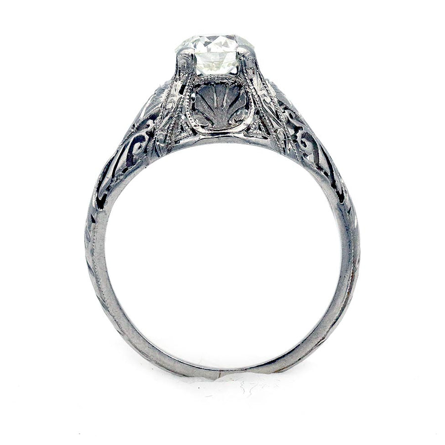 The Naritt ring is an authentic vintage diamond engagement ring from the Art Deco era, circa 1930s. Standing tall and proud in this one of a kind Art Deco ring is a glittering .60 carat old European cut diamond of H color and VS2 clarity. Beautifully crafted in platinum, accentuated with delicate filigree, milgrain engravings and floral engravings. A stunning vintage piece, in very good condition. Magnifique!
