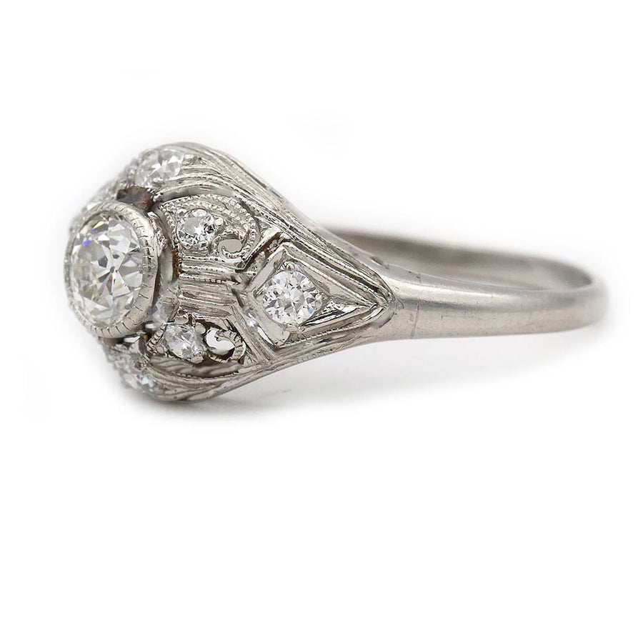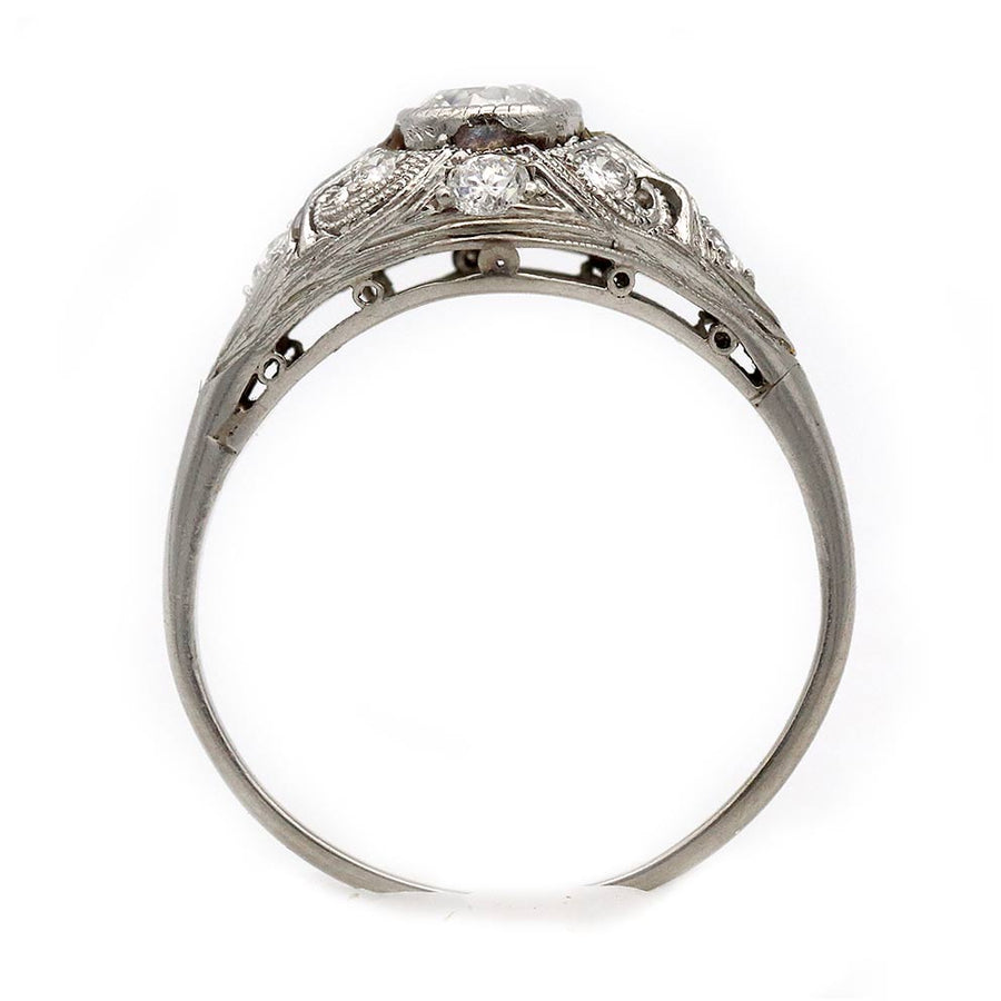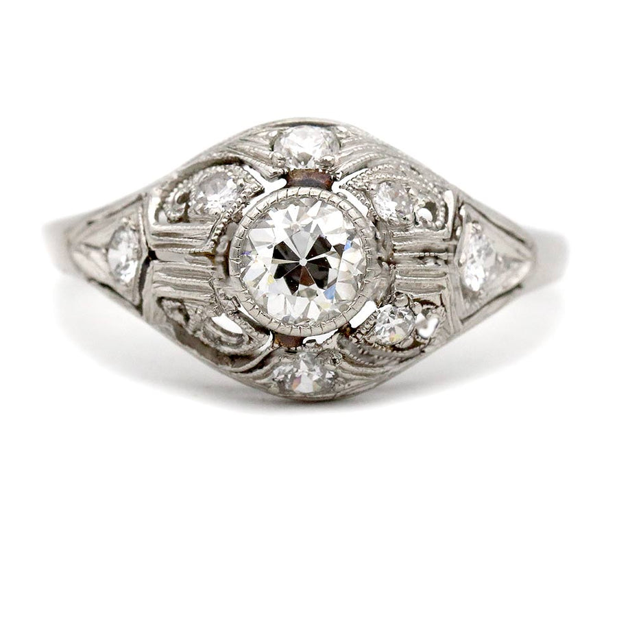 The Ella R ring is an authentic vintage engagement ring from the Art Deco era circa 1930s. The ring features an AGI certified .45 carat bezel set old European cut diamond. The diamond is flanked by 8 old European cut and single cut diamond accents. Beautifully crafted in platinum, accentuated with open metal work and intricate milgrain engravings. A clean, crisp vintage treasure with beautiful detailing. In excellent condition.