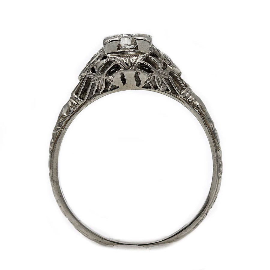 The Callie ring is an authentic vintage engagement ring from the Art Deco Era circa 1930's. The ring features a sparkling .20 carat old European cut diamond of E color, VS2 clarity, residing in a geometric square frame. The diamond is flanked by 2 single cut diamond accents. Crafted in 18 karat white gold, completed with open metal work and delicate filigree engravings. A classic, consummate Art Deco jewel. In very good condition.
