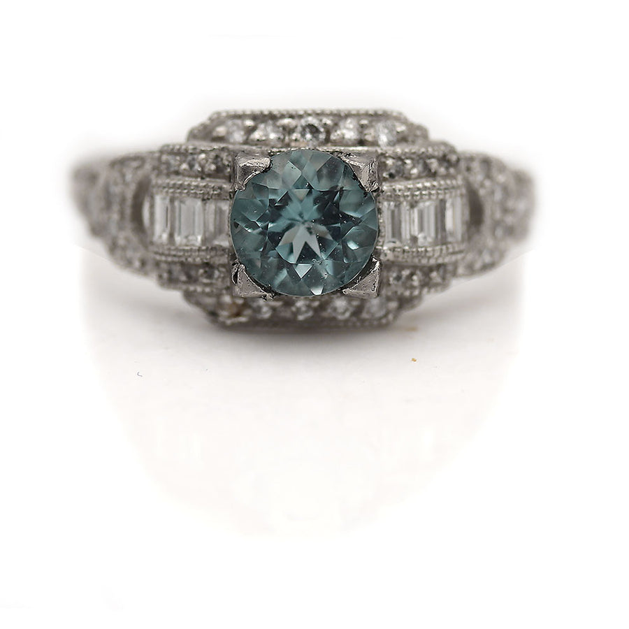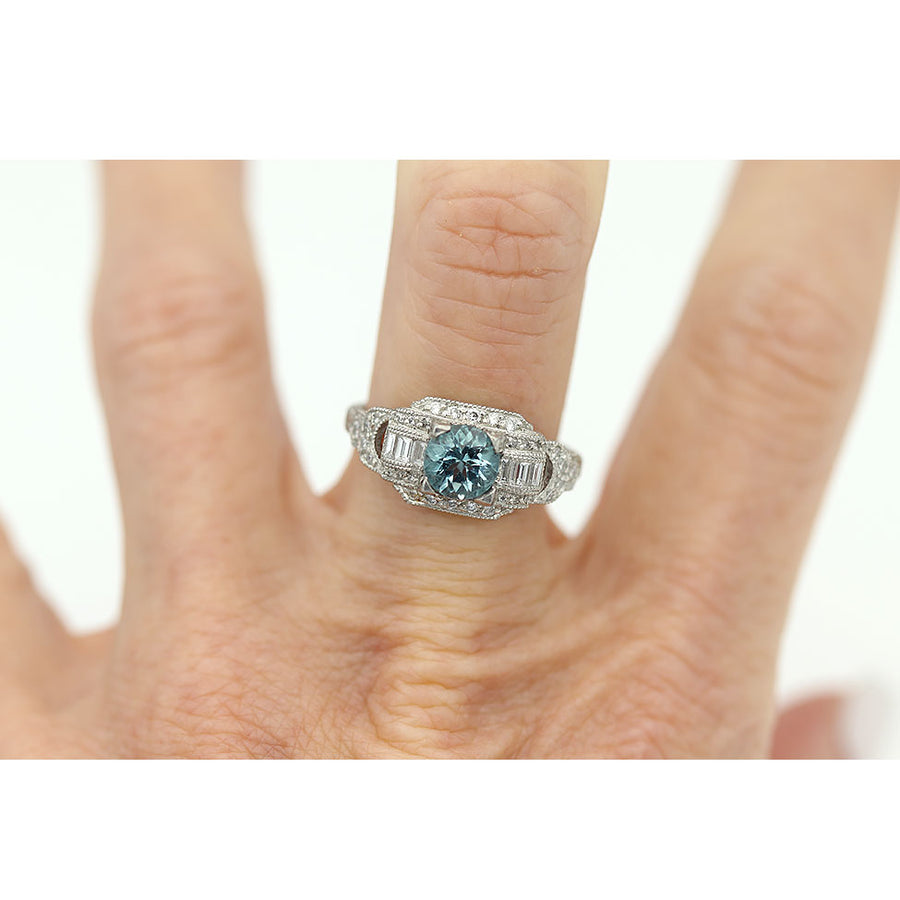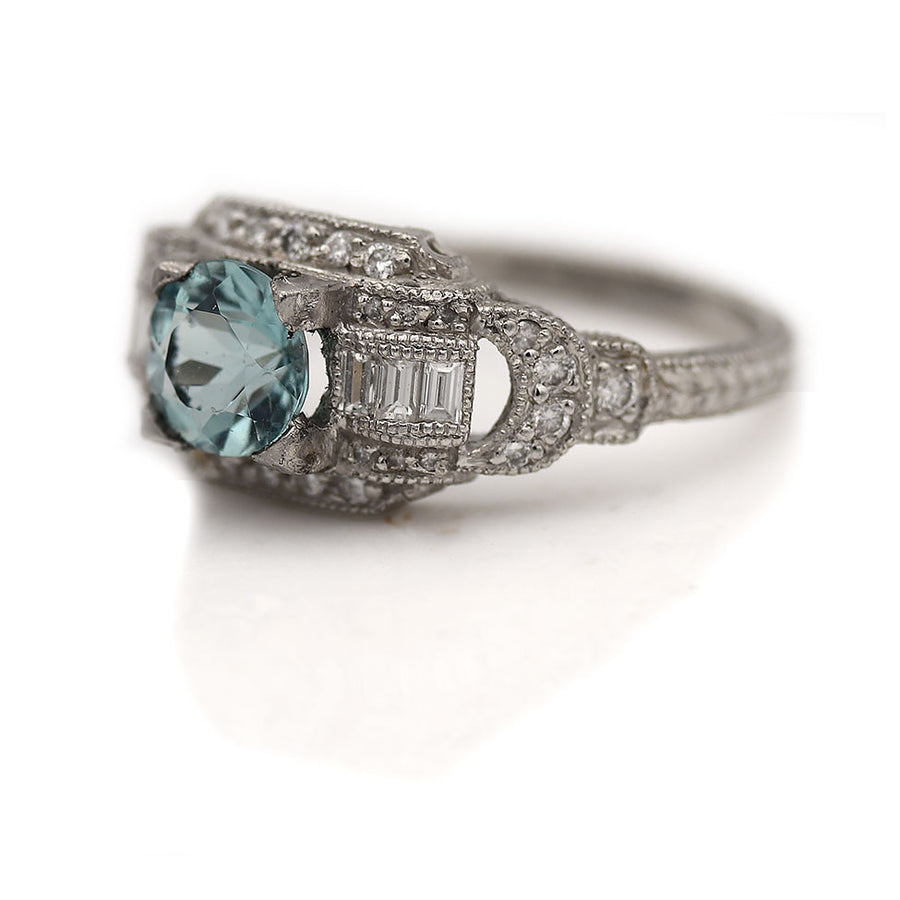 Art Deco Style 1.17 CTW Round Cut Aquamarine Baguette Diamond Gemstone Ring