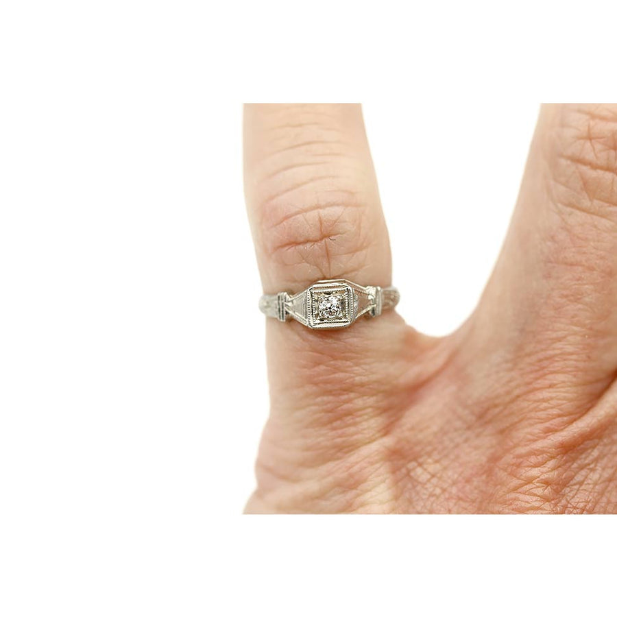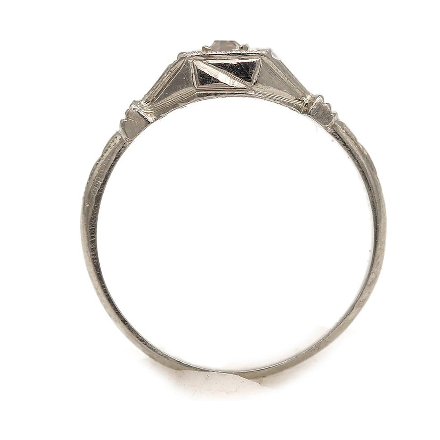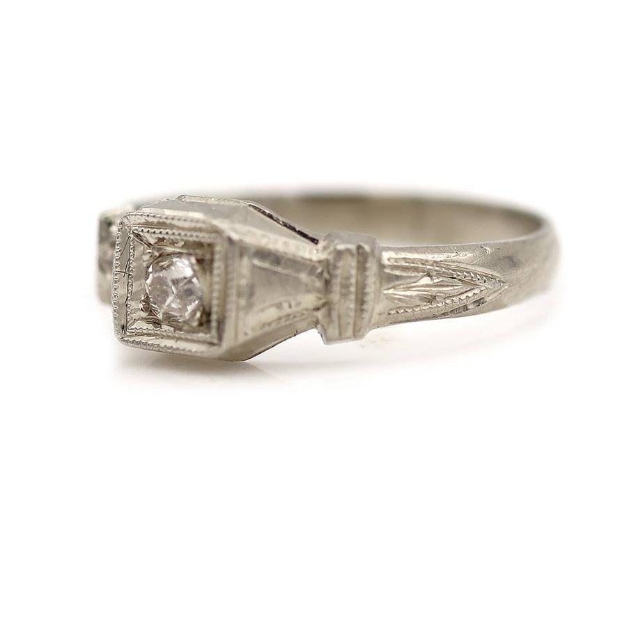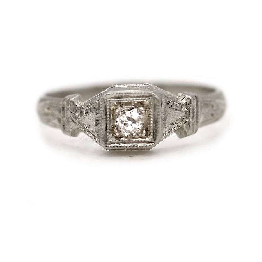The Sheryl ring is an authentic Art Deco engagement ring circa 1930s. The ring boasts a .10 carat old mine-cut diamond of H color, SI2 clarity, floating within a two tiered geometric square milgrain frame. Beautifully crafted in 14 karat white gold, accentuated with filigree engravings. A sweet vintage piece, with beautiful delicate engravings. In very good condition.